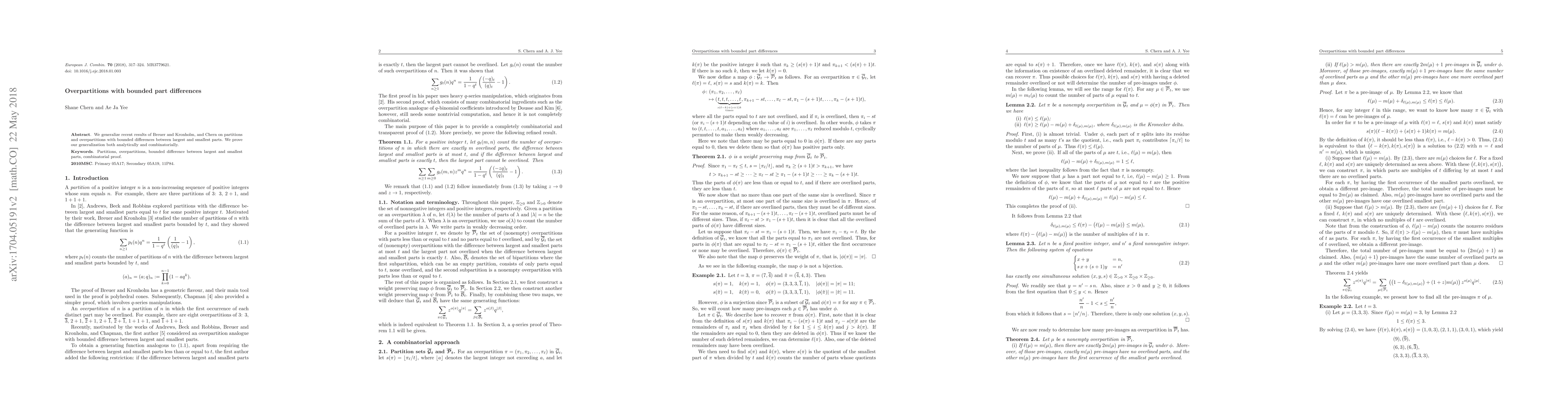 Summary: This paper generalizes prior results on partitions and overpartitions with constrained differences between the largest and smallest parts, proving the generalization through both analytical and combinatorial methods. The work extends the findings of Breuer, Kronholm, and Chern.