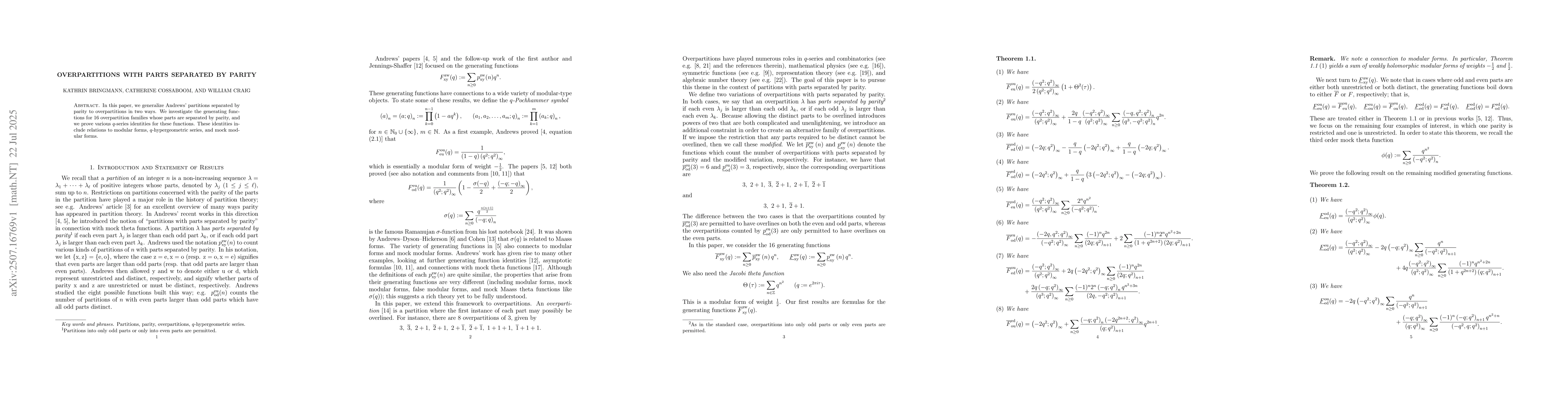 In this paper, we generalize Andrews' partitions separated by parity to overpartitions in two ways. We investigate the generating functions for 16 overpartition families whose parts are separated by parity, and we prove various $q$-series identities for these functions. These identities include relations to modular forms, $q$-hypergeometric series, and mock modular forms.