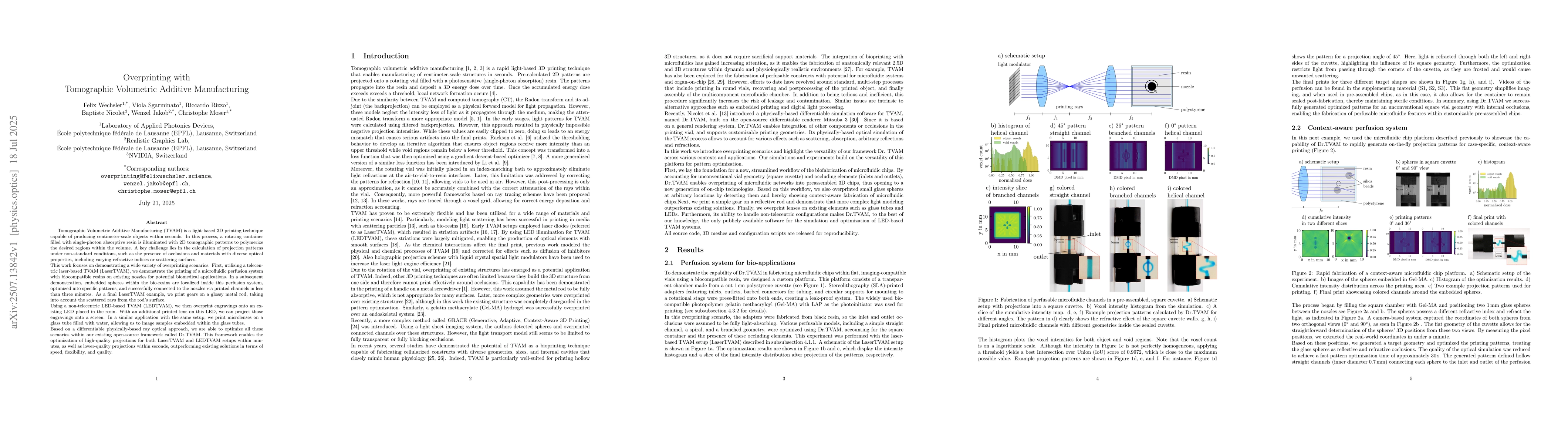 Tomographic Volumetric Additive Manufacturing (TVAM) is a light-based 3D printing technique capable of producing centimeter-scale objects within seconds. A key challenge lies in the calculation of projection patterns under non-standard conditions, such as the presence of occlusions and materials with diverse optical properties, including varying refractive indices or scattering surfaces. This work focuses on demonstrating a wide variety of overprinting scenarios. First, utilizing a telecentric laser-based TVAM (LaserTVAM), we demonstrate the printing of a microfluidic perfusion system with biocompatible resins on existing nozzles for potential biomedical applications. In a subsequent demonstration, embedded spheres within the bio-resins are localized inside this perfusion system, optimized into specific patterns, and successfully connected to the nozzles via printed channels in less than three minutes. As a final LaserTVAM example, we print gears on a glossy metal rod, taking into account the scattered rays from the rod's surface. Using a non-telecentric LED-based TVAM (LEDTVAM), we then overprint engravings onto an existing LED placed in the resin. With an additional printed lens on this LED, we can project those engravings onto a screen. In a similar application with the same setup, we print microlenses on a glass tube filled with water, allowing us to image samples embedded within the glass tubes. Based on a differentiable physically-based ray optical approach, we are able to optimize all these scenarios within our existing open-source framework called Dr.TVAM. This framework enables the optimization of high-quality projections for both LaserTVAM and LEDTVAM setups within minutes, as well as lower-quality projections within seconds, outperforming existing solutions in terms of speed, flexibility, and quality.