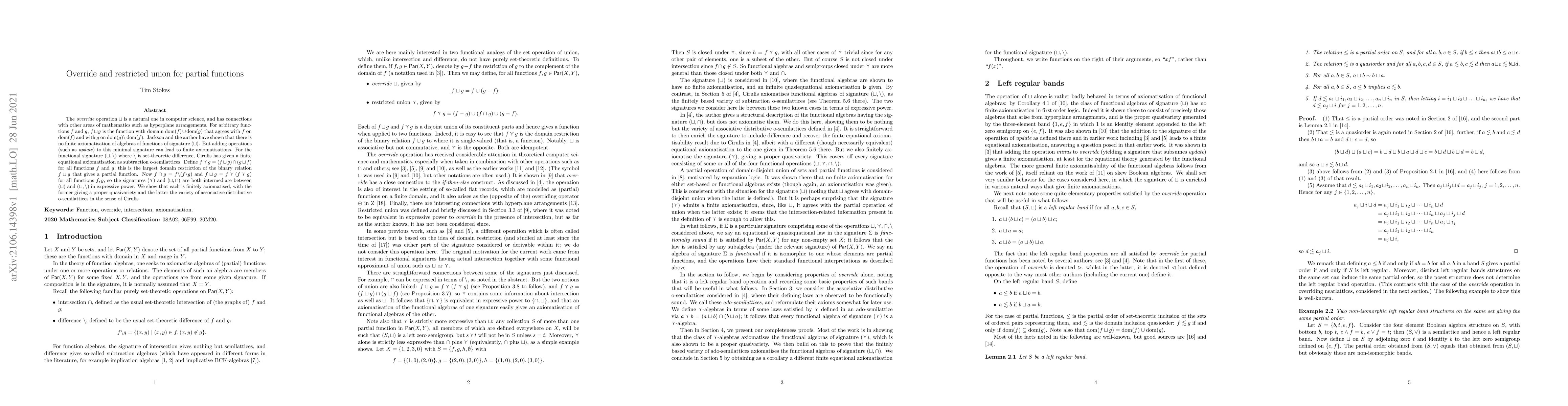 The {\em override} operation $\sqcup$ is a natural one in computer science, and has connections with other areas of mathematics such as hyperplane arrangements. For arbitrary functions $f$ and $g$, $f\sqcup g$ is the function with domain $dom(f)\cup dom(g)$ that agrees with $f$ on $dom(f)$ and with $g$ on $dom(g) \backslash dom(f)$. Jackson and the author have shown that there is no finite axiomatisation of algebras of functions of signature $(\sqcup)$. But adding operations (such as {\em update}) to this minimal signature can lead to finite axiomatisations. For the functional signature $(\sqcup,\backslash)$ where $\backslash$ is set-theoretic difference, Cirulis has given a finite equational axiomatisation as subtraction o-semilattices. Define $f\curlyvee g=(f\sqcup g)\cap (g\sqcup f)$ for all functions $f$ and $g$; this is the largest domain restriction of the binary relation $f\cup g$ that gives a partial function. Now $f\cap g=f\backslash(f\backslash g)$ and $f\sqcup g=f\curlyvee(f\curlyvee g)$ for all functions $f,g$, so the signatures $(\curlyvee)$ and $(\sqcup,\cap)$ are both intermediate between $(\sqcup)$ and $(\sqcup,\backslash)$ in expressive power. We show that each is finitely axiomatised, with the former giving a proper quasivariety and the latter the variety of associative distributive o-semilattices in the sense of Cirulis.