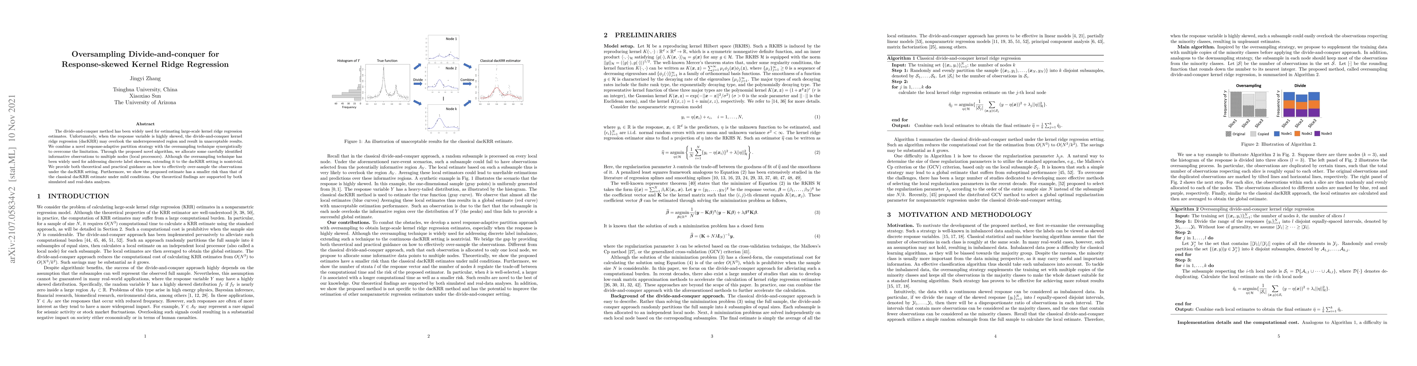 The divide-and-conquer method has been widely used for estimating large-scale kernel ridge regression estimates. Unfortunately, when the response variable is highly skewed, the divide-and-conquer kernel ridge regression (dacKRR) may overlook the underrepresented region and result in unacceptable results. We combine a novel response-adaptive partition strategy with the oversampling technique synergistically to overcome the limitation. Through the proposed novel algorithm, we allocate some carefully identified informative observations to multiple nodes (local processors). Although the oversampling technique has been widely used for addressing discrete label skewness, extending it to the dacKRR setting is nontrivial. We provide both theoretical and practical guidance on how to effectively over-sample the observations under the dacKRR setting. Furthermore, we show the proposed estimate has a smaller risk than that of the classical dacKRR estimate under mild conditions. Our theoretical findings are supported by both simulated and real-data analyses.