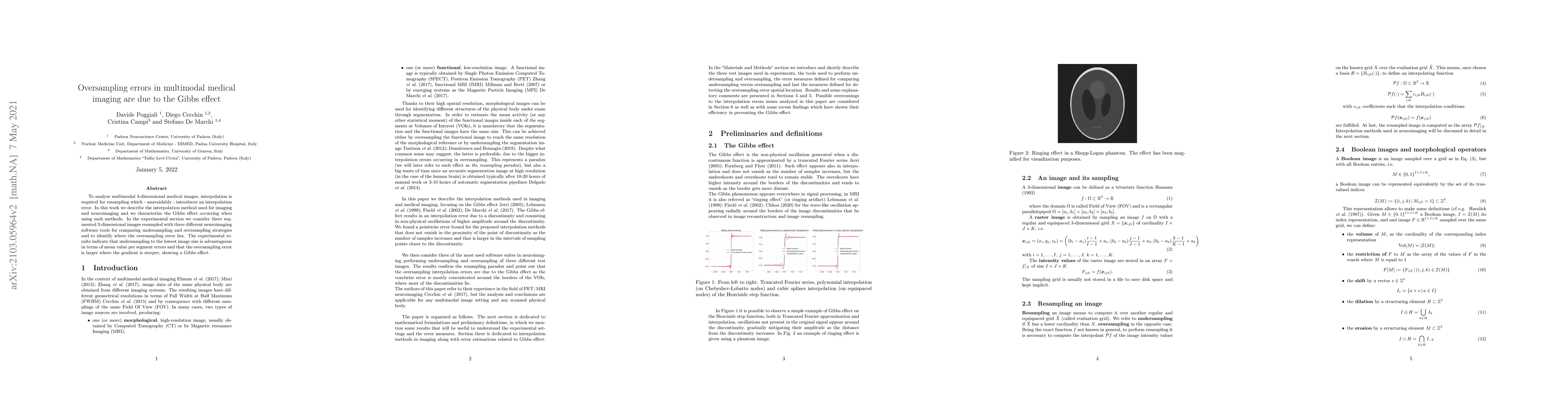 To analyse multimodal 3-dimensional medical images, interpolation is required for resampling which - unavoidably - introduces an interpolation error. In this work we consider three segmented 3-dimensional images resampled with three different neuroimaging software tools for comparing undersampling and oversampling strategies and to identify where the oversampling error lies. The results indicate that undersampling to the lowest image size is advantageous in terms of mean value per segment errors and that the oversampling error is larger where the gradient is steeper, showing a Gibbs effect.