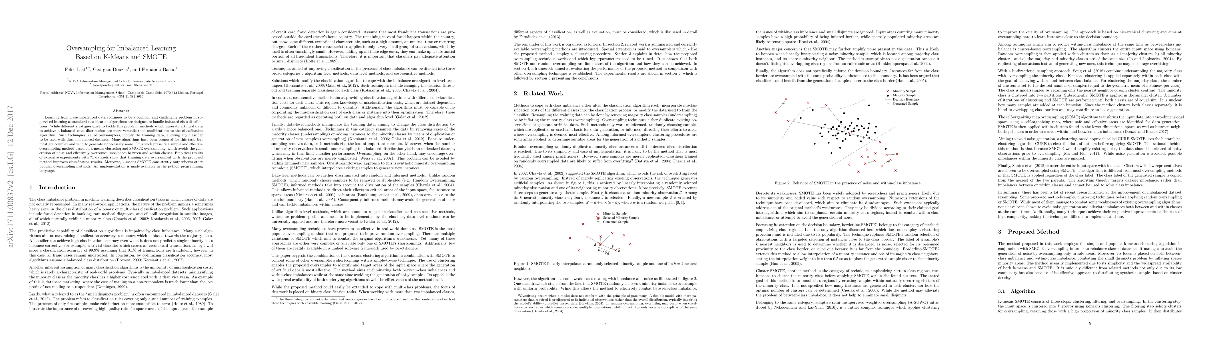 This paper proposes a simple oversampling method combining k-means clustering with SMOTE to address class imbalance in supervised learning. The method effectively balances class distributions without generating unnecessary noise, leading to improved classification results across 71 datasets.
