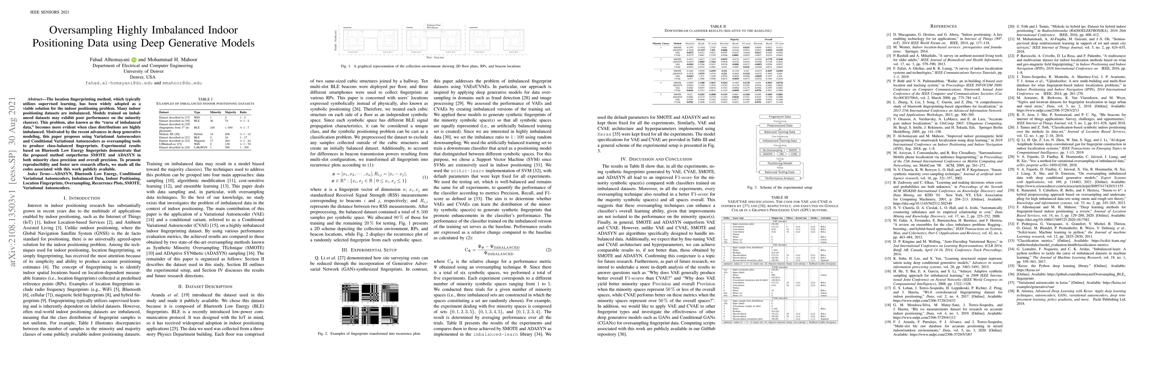This paper proposes using Variational Autoencoders and Conditional Variational Autoencoders to oversample highly imbalanced indoor positioning data, aiming to improve model performance on minority classes. The method outperforms SMOTE and ADASYN in precision, and the authors have made their code publicly available to facilitate reproducibility and further research.
