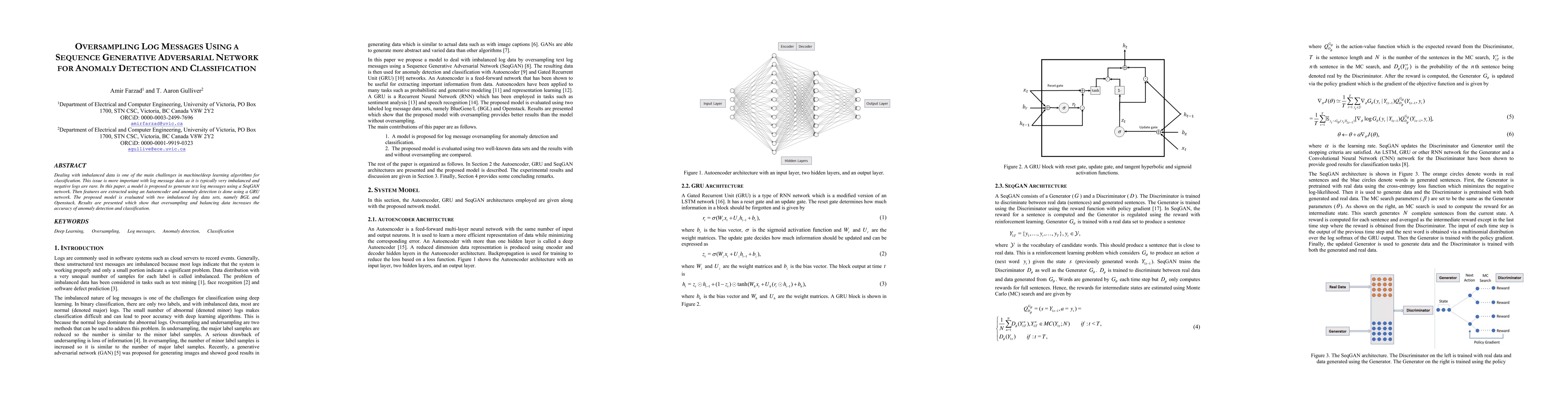 This paper proposes a SeqGAN network for generating text log messages to address imbalanced data challenges in anomaly detection. Features are extracted using an Autoencoder, and a GRU network is employed for anomaly detection, showing improved accuracy in classification on the BGL and Openstack datasets.