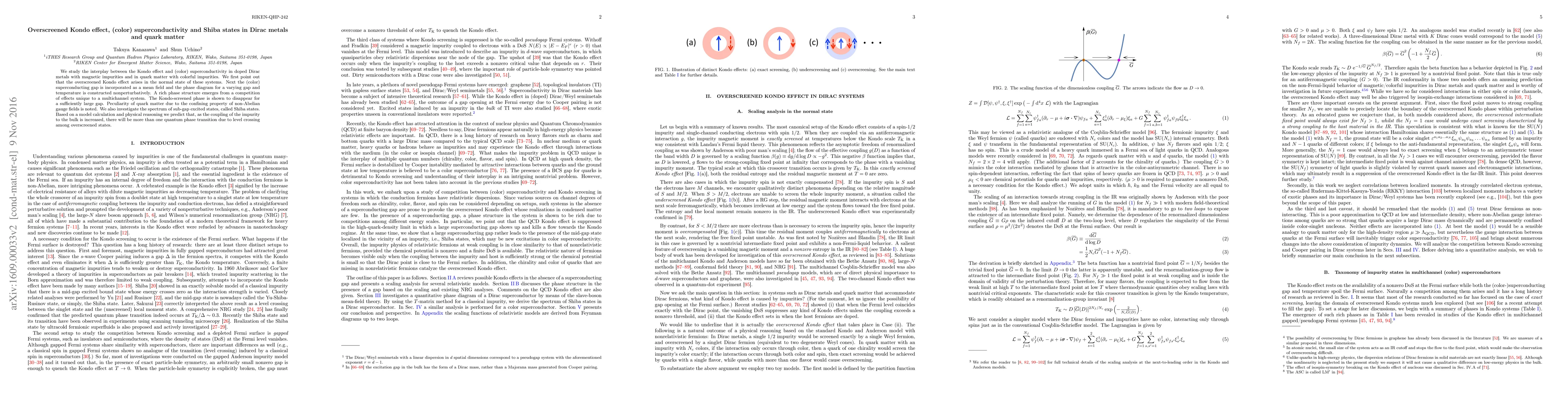 This paper explores the interplay between the Kondo effect and (color) superconductivity in doped Dirac metals and quark matter, revealing the emergence of an overscreened Kondo effect and a complex phase diagram. It also investigates Shiba states and predicts multiple quantum phase transitions due to level crossings in overscreened states.
