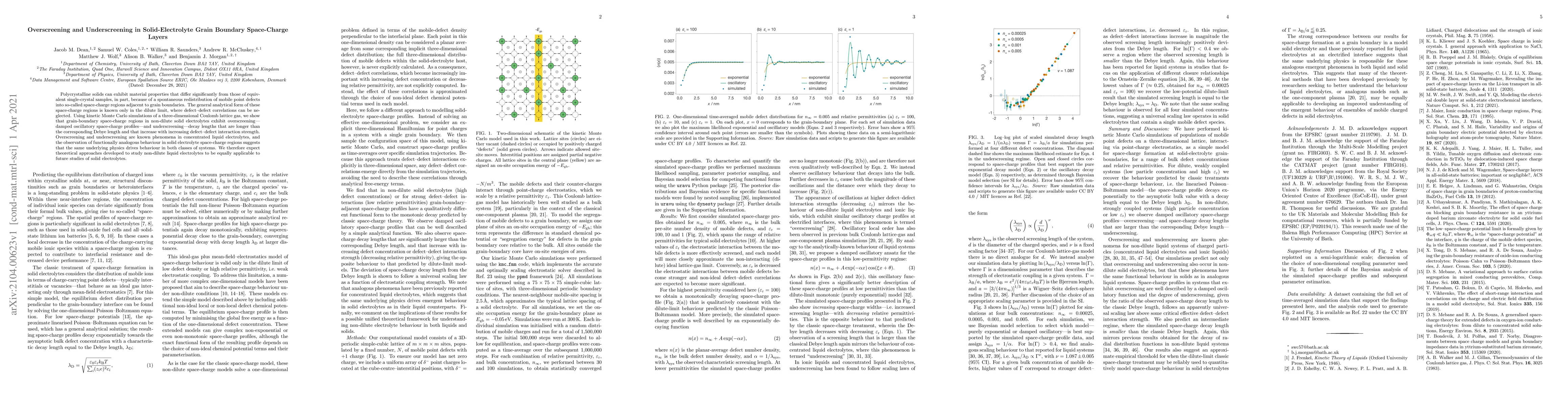 This paper investigates grain boundary space-charge regions in solid electrolytes using kinetic Monte Carlo simulations, revealing overscreening and underscreening phenomena analogous to those in liquid electrolytes. The findings suggest that theoretical models for liquid electrolytes can be applied to solid electrolytes.