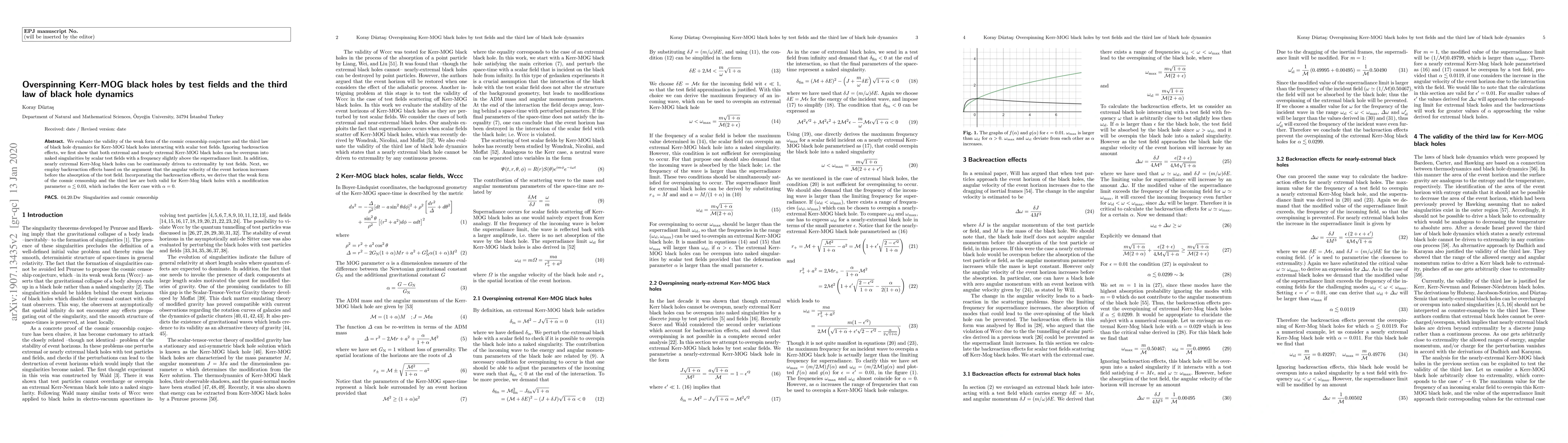 We evaluate the validity of the weak form of the cosmic censorship conjecture and the third law of black hole dynamics for Kerr-MOG black holes interacting with scalar test fields. Ignoring backreaction effects, we first show that both extremal and nearly extremal Kerr-MOG black holes can be overspun into naked singularities by scalar test fields with a frequency slightly above the superradiance limit. In addition, nearly extremal Kerr-Mog black holes can be continuously driven to extremality by test fields. Next, we employ backreaction effects based on the argument that the angular velocity of the event horizon increases before the absorption of the test field. Incorporating the backreaction effects, we derive that the weak form of the cosmic censorship and the third law are both valid for Kerr-Mog black holes with a modification parameter $\alpha \lesssim 0.03$, which includes the Kerr case with $\alpha=0$.