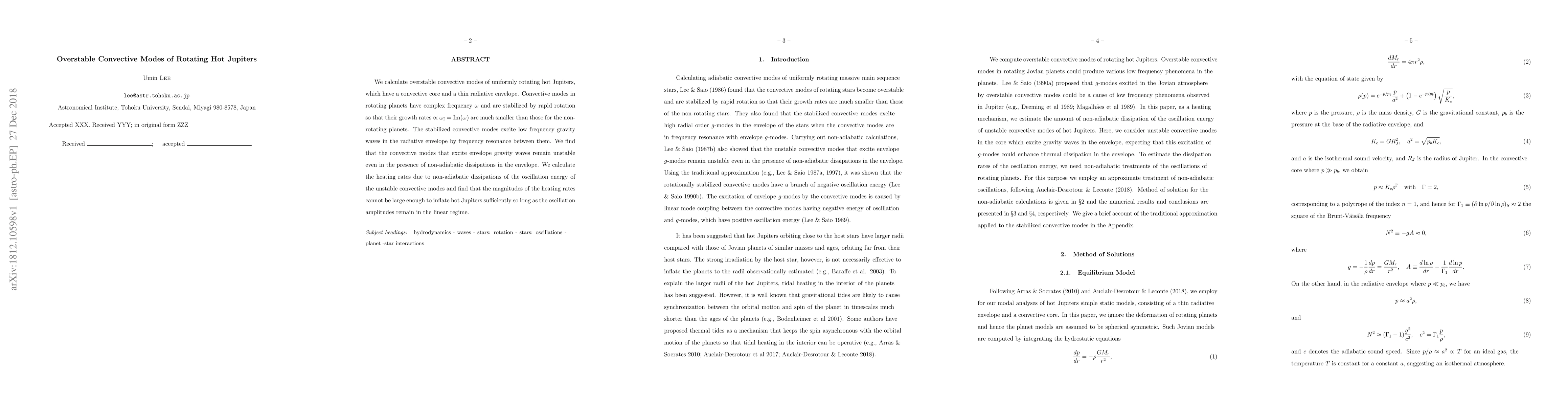 This paper investigates the overstable convective modes in rotating hot Jupiters, finding that rapid rotation stabilizes these modes and leads to the excitation of low-frequency gravity waves. Despite non-adiabatic dissipations, the convective modes remain unstable, but the resulting heating is insufficient to significantly inflate the planets.