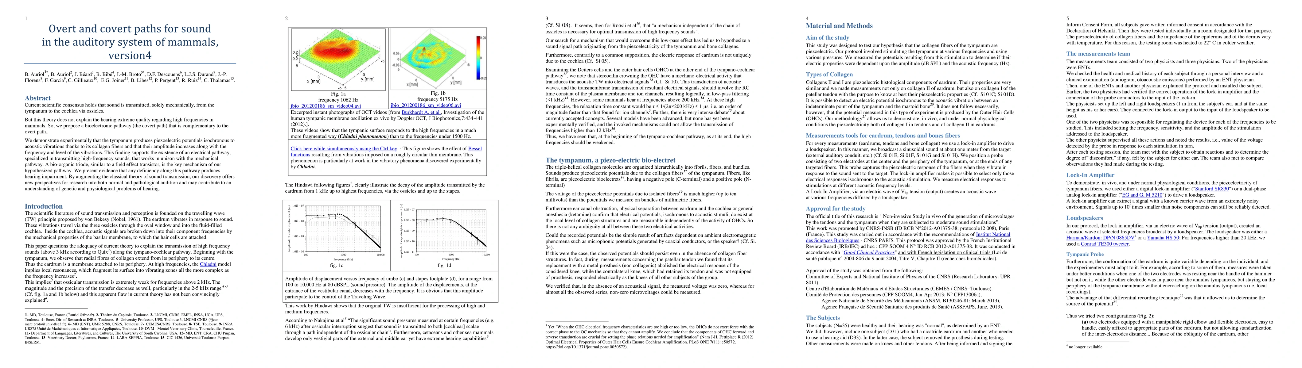 This paper proposes a complementary bioelectronic pathway (covert path) alongside the traditional mechanical pathway for sound transmission in mammals, suggesting that piezoelectric potentials from the tympanum aid in high-frequency sound detection. Experimental evidence supports the existence of this electrical pathway, which involves a bio-organic triode mechanism, and its deficiency is linked to hearing impairment.