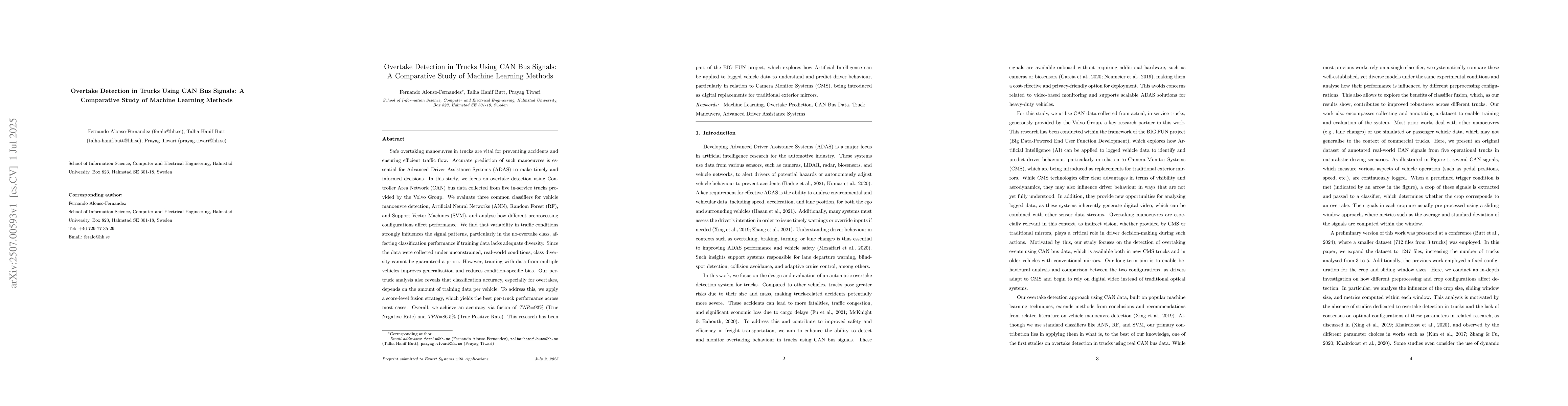 Safe overtaking manoeuvres in trucks are vital for preventing accidents and ensuring efficient traffic flow. Accurate prediction of such manoeuvres is essential for Advanced Driver Assistance Systems (ADAS) to make timely and informed decisions. In this study, we focus on overtake detection using Controller Area Network (CAN) bus data collected from five in-service trucks provided by the Volvo Group. We evaluate three common classifiers for vehicle manoeuvre detection, Artificial Neural Networks (ANN), Random Forest (RF), and Support Vector Machines (SVM), and analyse how different preprocessing configurations affect performance. We find that variability in traffic conditions strongly influences the signal patterns, particularly in the no-overtake class, affecting classification performance if training data lacks adequate diversity. Since the data were collected under unconstrained, real-world conditions, class diversity cannot be guaranteed a priori. However, training with data from multiple vehicles improves generalisation and reduces condition-specific bias. Our pertruck analysis also reveals that classification accuracy, especially for overtakes, depends on the amount of training data per vehicle. To address this, we apply a score-level fusion strategy, which yields the best per-truck performance across most cases. Overall, we achieve an accuracy via fusion of TNR=93% (True Negative Rate) and TPR=86.5% (True Positive Rate). This research has been part of the BIG FUN project, which explores how Artificial Intelligence can be applied to logged vehicle data to understand and predict driver behaviour, particularly in relation to Camera Monitor Systems (CMS), being introduced as digital replacements for traditional exterior mirrors.