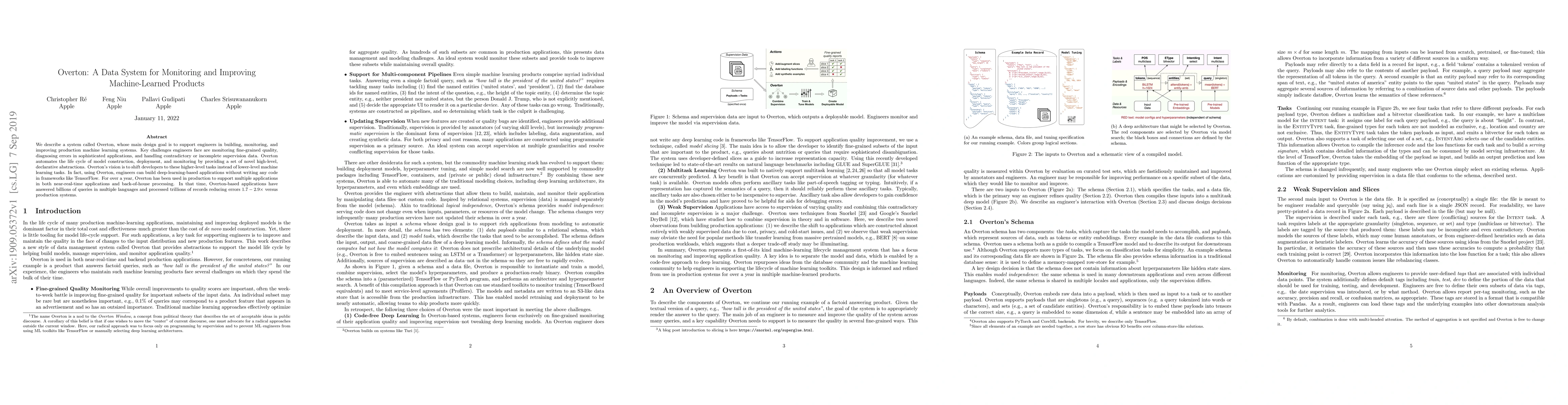 We describe a system called Overton, whose main design goal is to support engineers in building, monitoring, and improving production machine learning systems. Key challenges engineers face are monitoring fine-grained quality, diagnosing errors in sophisticated applications, and handling contradictory or incomplete supervision data. Overton automates the life cycle of model construction, deployment, and monitoring by providing a set of novel high-level, declarative abstractions. Overton's vision is to shift developers to these higher-level tasks instead of lower-level machine learning tasks. In fact, using Overton, engineers can build deep-learning-based applications without writing any code in frameworks like TensorFlow. For over a year, Overton has been used in production to support multiple applications in both near-real-time applications and back-of-house processing. In that time, Overton-based applications have answered billions of queries in multiple languages and processed trillions of records reducing errors 1.7-2.9 times versus production systems.