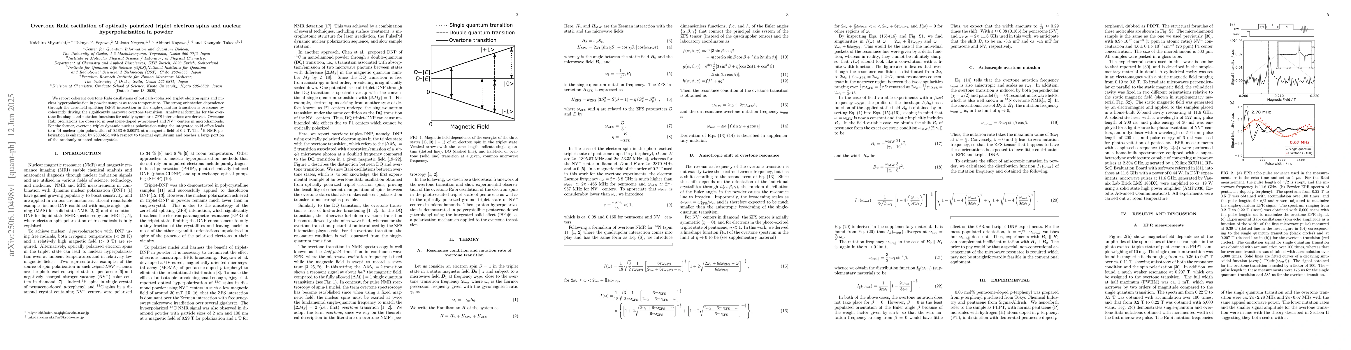 Researchers observed coherent overtone Rabi oscillations of optically-polarized triplet electron spins in powder samples at room temperature, enabling efficient nuclear hyperpolarization. This discovery has significant implications for solid-state NMR and dynamic nuclear polarization applications.
