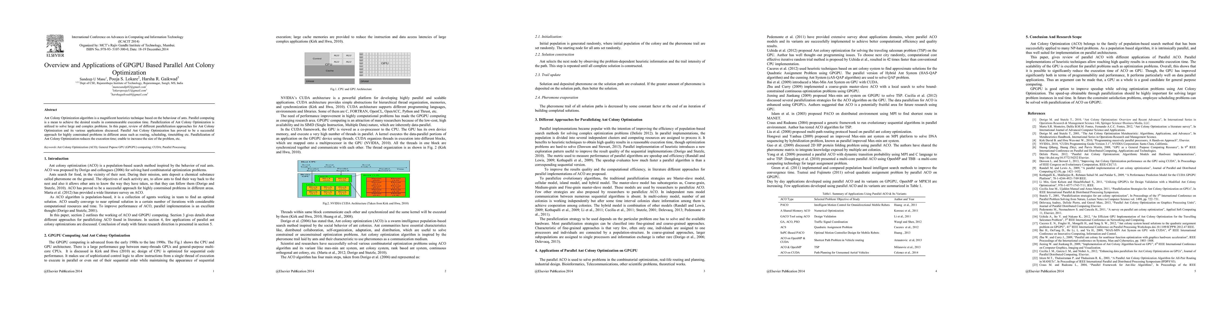 This paper reviews parallelization techniques for the Ant Colony Optimization algorithm, highlighting its applications in solving large-scale problems like routing and scheduling. The use of GPGPU-based parallelization significantly reduces execution time and enhances problem-solving capabilities.