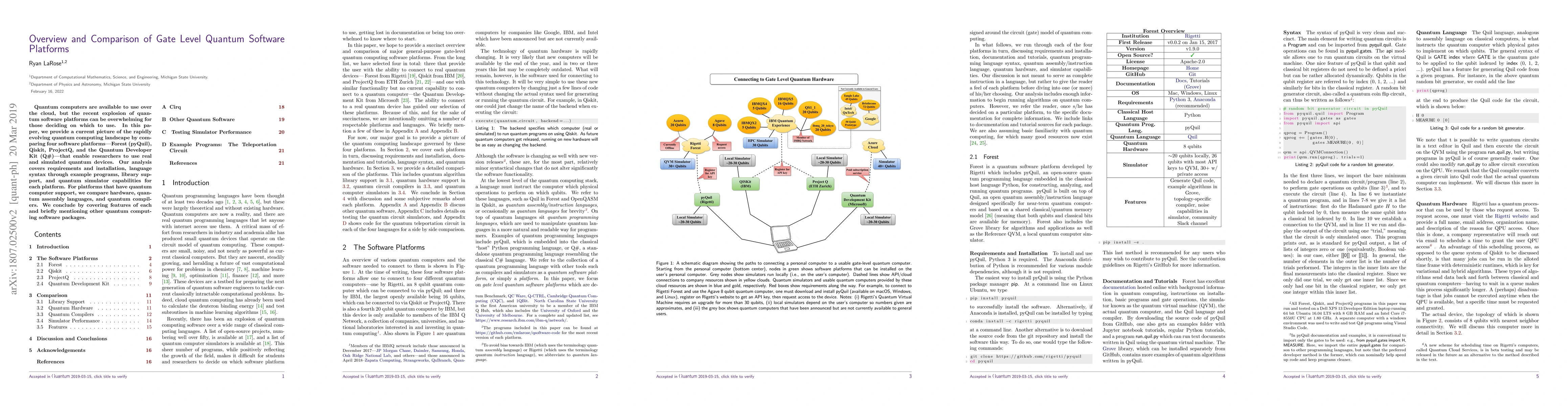 This paper compares four leading gate-level quantum software platforms—Forest (pyQuil), Qiskit, ProjectQ, and Q#—focusing on their requirements, installation, language syntax, library support, and quantum simulator capabilities. It also evaluates hardware, quantum assembly languages, and quantum compilers for platforms with quantum computer support.