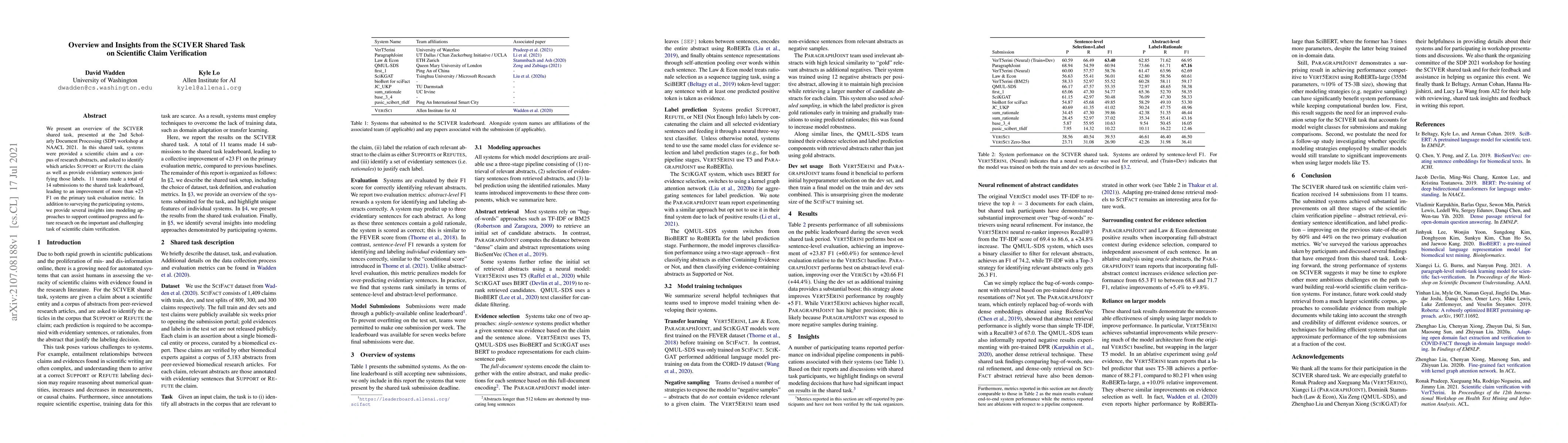 The SciVer shared task at the 2021 NAACL SDP workshop evaluated systems in verifying scientific claims against research abstracts, with 11 teams submitting 14 entries, boosting the F1 score by over 23 points. Insights from the task highlight effective modeling strategies for future scientific claim verification efforts.