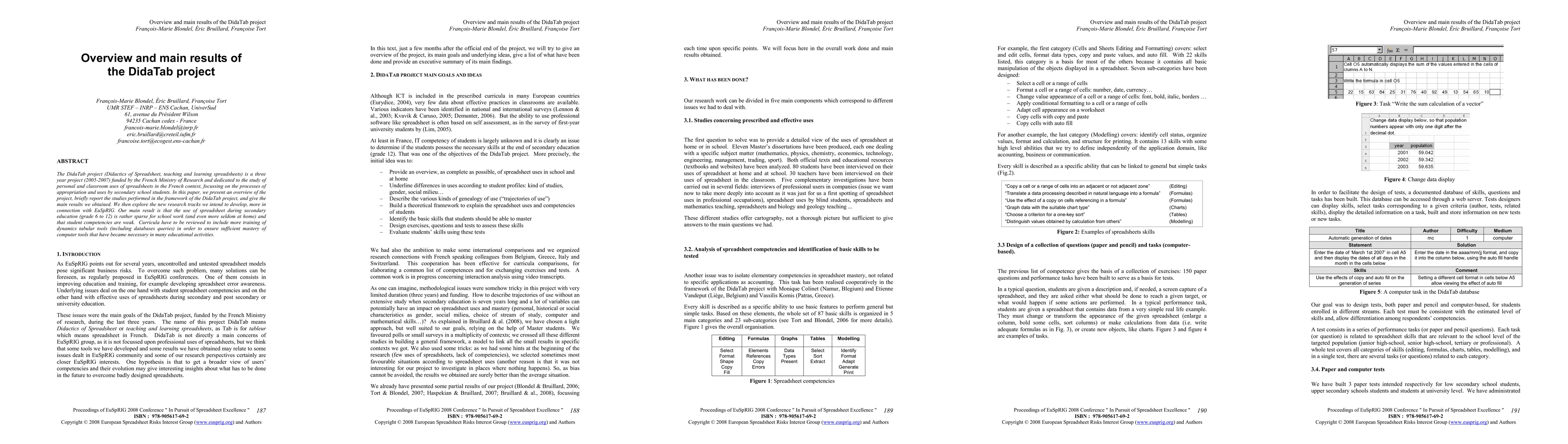 The DidaTab project (Didactics of Spreadsheet, teaching and learning spreadsheets) is a three year project (2005-2007) funded by the French Ministry of Research and dedicated to the study of personal and classroom uses of spreadsheets in the French context, focussing on the processes of appropriation and uses by secondary school students. In this paper, we present an overview of the project, briefly report the studies performed in the framework of the DidaTab project, and give the main results we obtained. We then explore the new research tracks we intend to develop, more in connection with EuSpRIG. Our main result is that the use of spreadsheet during secondary education (grade 6 to 12) is rather sparse for school work (and even more seldom at home) and that student competencies are weak. Curricula have to be reviewed to include more training of dynamics tabular tools (including databases queries) in order to ensure sufficient mastery of computer tools that have became necessary in many educational activities.