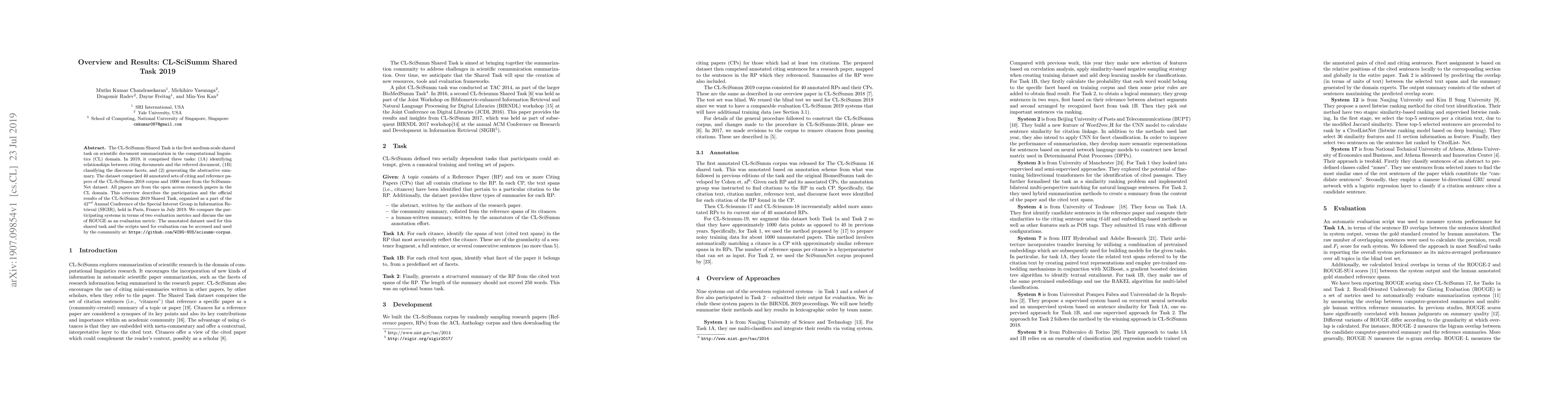 The task comprised three subtasks, including identifying relationships between citing documents, classifying discourse facets, and generating abstractive summaries from a large annotated dataset.