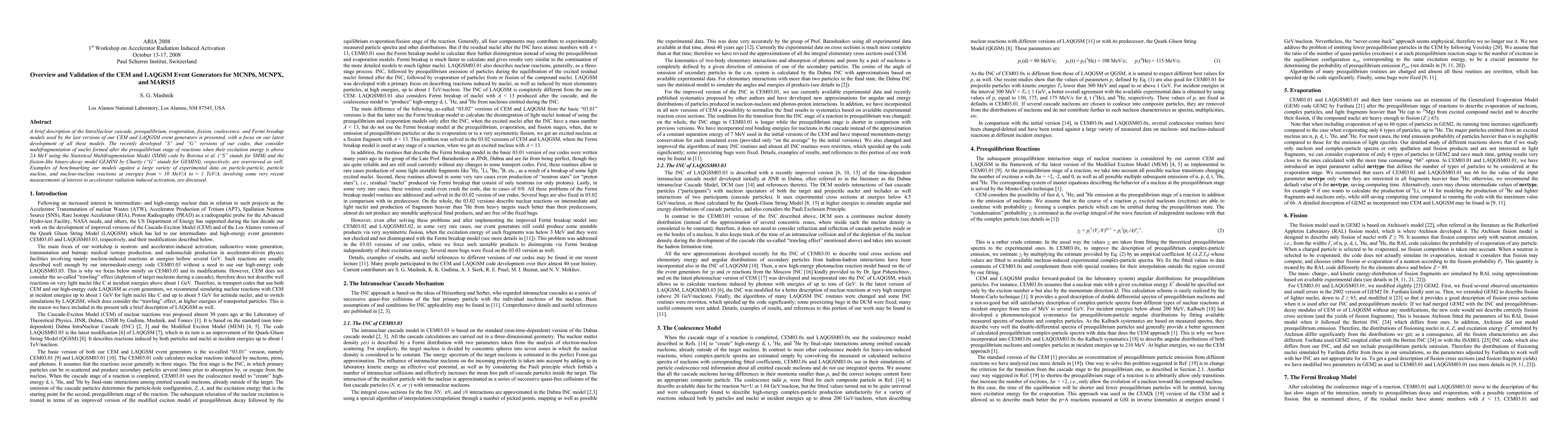 A brief description of the IntraNuclear cascade, preequilibrium, evaporation, fission, coalescence, and Fermi breakup models used by the last versions of our CEM and LAQGSM event generators is presented, with a focus on our latest development of all these models. The recently developed "S" and "G" versions of our codes, that consider multifragmentation of nuclei formed after the preequilibrium stage of reactions when their excitation energy is above 2A MeV using the Statistical Multifragmentation Model (SMM) code by Botvina et al. ("S" stands for SMM) and the fission-like binary-decay model GEMINI by Charity ("G" stands for GEMINI), respectively, are overviewed as well. Examples of benchmarking our models against a large variety of experimental data on particle-particle, particle nucleus, and nucleus-nucleus reactions, involving some very recent measurements of interest to accelerator radiation induced activation, are discussed.