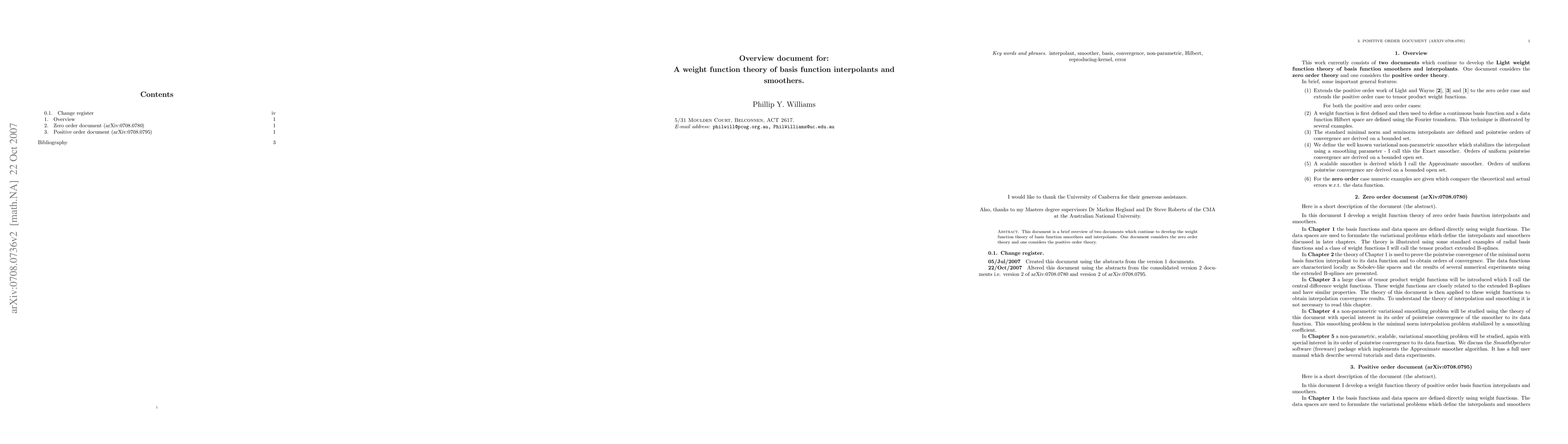 This document is a brief overview of two documents which continue to develop the weight function theory of basis function smoothers and interpolants. One document considers the zero order theory and one considers the positive order theory.