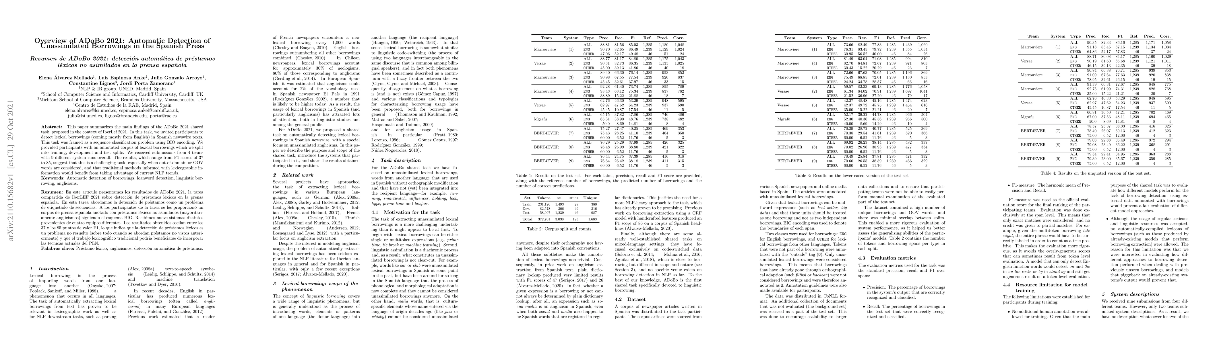 This paper summarizes the ADoBo 2021 shared task focused on detecting lexical borrowings in Spanish press texts, primarily from English. The task yielded F1 scores between 37 and 85, indicating challenges, especially with out-of-domain words, and suggesting that current NLP trends could enhance traditional lexicographic methods.