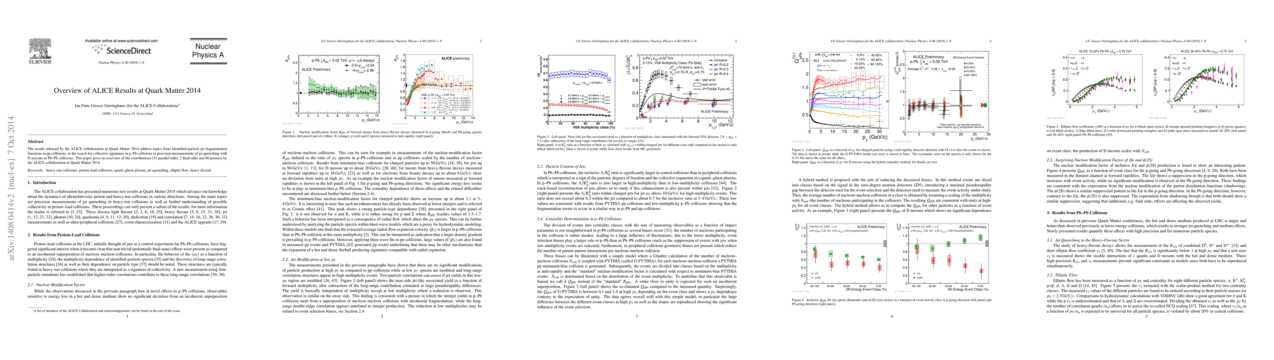 The ALICE collaboration presented findings at Quark Matter 2014, including studies on jet fragmentation in pp collisions, evidence of collective behavior in p-Pb collisions, and precise measurements of jet quenching via D mesons in Pb-Pb collisions. The overview encompasses 31 parallel talks, 2 flash talks, and 80 posters.