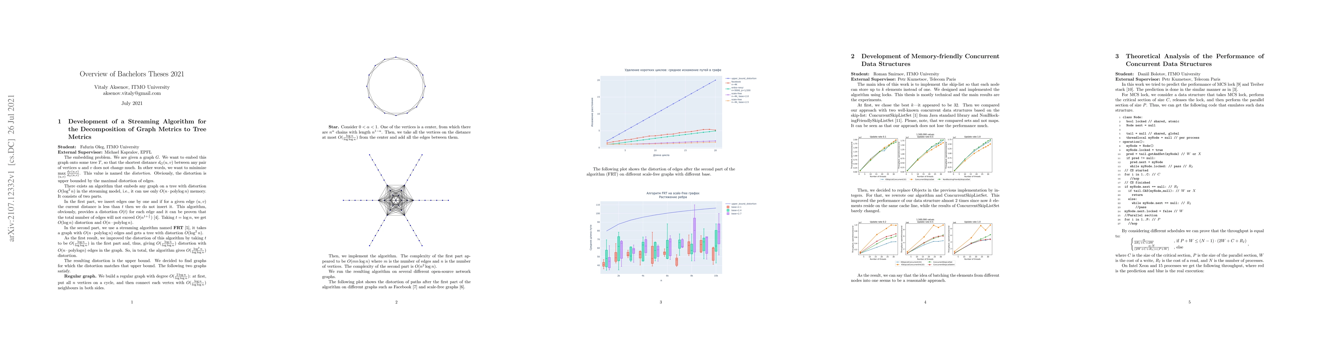 In this work, we review Bachelors Theses done under the supervision of Vitaly Aksenov at ITMO University. This overview contains the short description of six theses: "Development of a Streaming Algorithm for the Decomposition of Graph Metrics to Tree Metrics" by Oleg Fafurin, "Development of Memory-friendly Concurrent Data Structures" by Roman Smirnov, "Theoretical Analysis of the Performance of Concurrent Data Structures" by Daniil Bolotov, "Parallel Batched Interpolation Search Tree" by Alena Martsenyuk, "Parallel Batched Self-adjusting Data Structures" by Vitalii Krasnov, and "Parallel Batched Persistent Binary Search Trees" by Ildar Zinatulin.