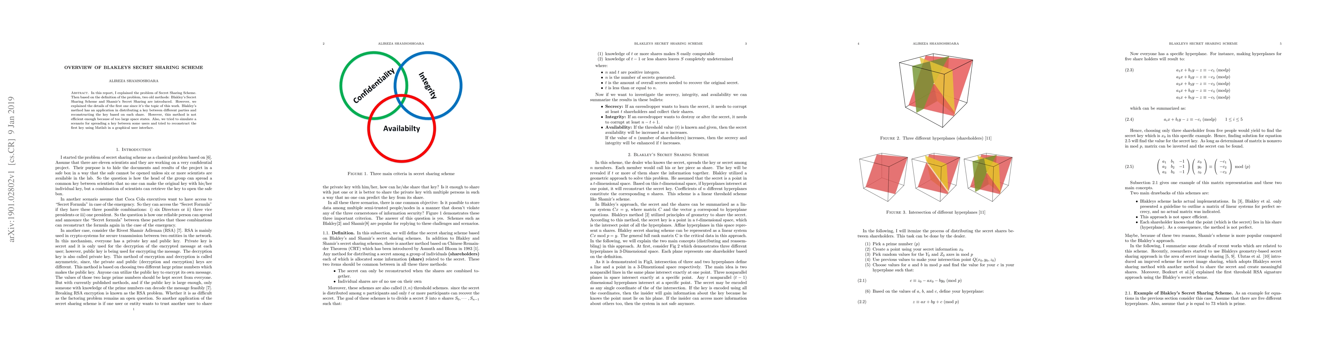 This paper provides an overview of Blakley's Secret Sharing Scheme, comparing it with Shamir's method, and discusses its application in key distribution. Despite its conceptual advantages, Blakley's scheme is noted for its inefficiency due to large space states, and a simulation using Matlab is presented to demonstrate its reconstruction process.