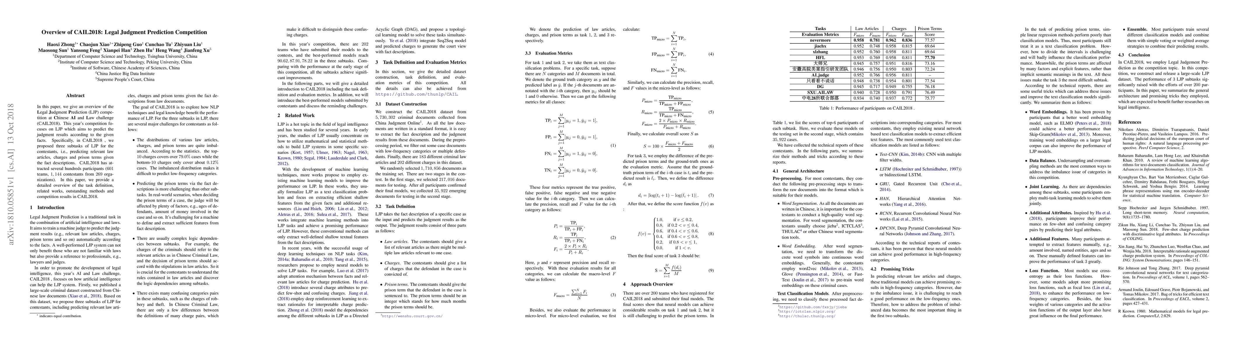 In this paper, we give an overview of the Legal Judgment Prediction (LJP) competition at Chinese AI and Law challenge (CAIL2018). This competition focuses on LJP which aims to predict the judgment results according to the given facts. Specifically, in CAIL2018 , we proposed three subtasks of LJP for the contestants, i.e., predicting relevant law articles, charges and prison terms given the fact descriptions. CAIL2018 has attracted several hundreds participants (601 teams, 1, 144 contestants from 269 organizations). In this paper, we provide a detailed overview of the task definition, related works, outstanding methods and competition results in CAIL2018.
