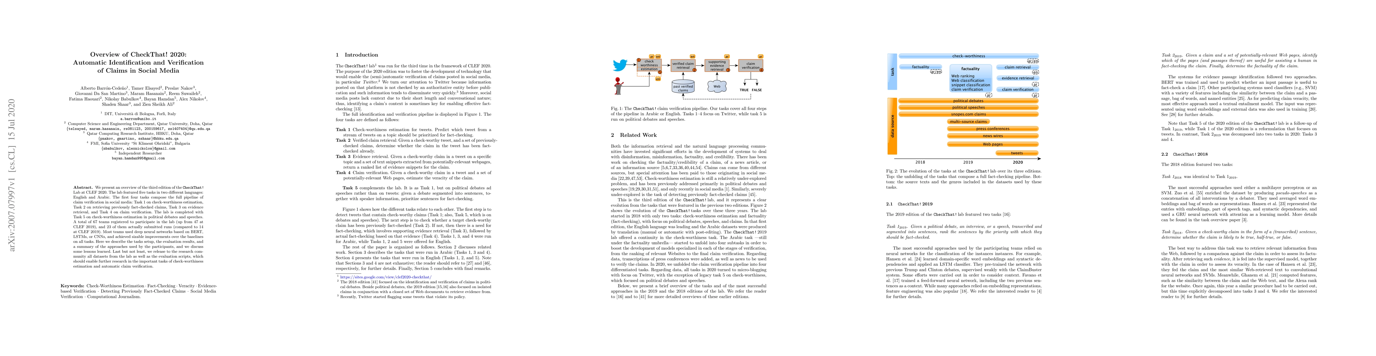The CheckThat! 2020 lab at CLEF introduced five tasks for automatic identification and verification of claims in social media, with notable improvements achieved by teams using deep neural networks. The lab released datasets and evaluation scripts to foster further research in claim verification.