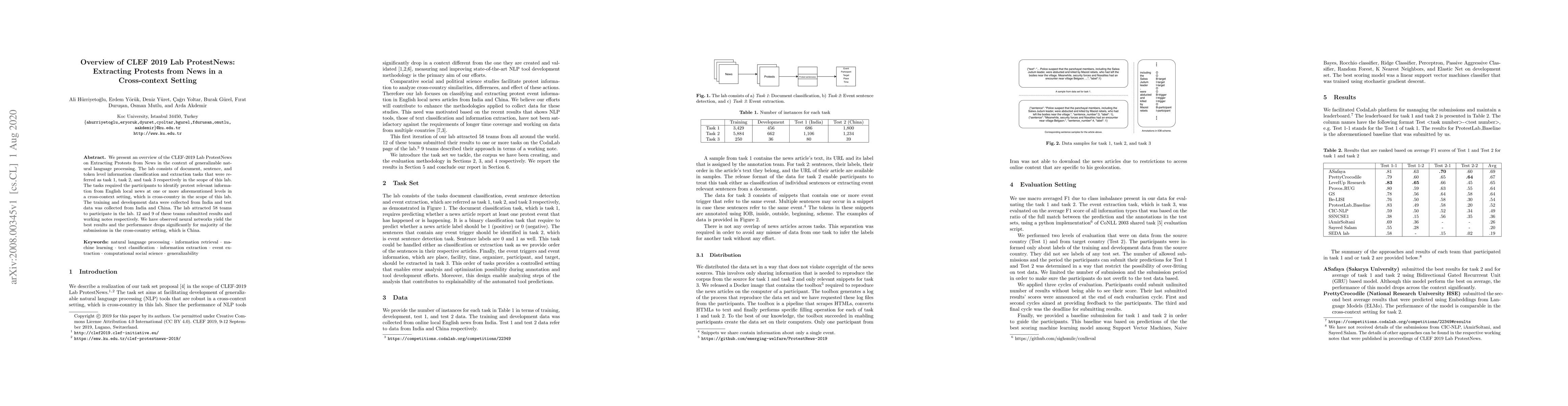 We present an overview of the CLEF-2019 Lab ProtestNews on Extracting Protests from News in the context of generalizable natural language processing. The lab consists of document, sentence, and token level information classification and extraction tasks that were referred as task 1, task 2, and task 3 respectively in the scope of this lab. The tasks required the participants to identify protest relevant information from English local news at one or more aforementioned levels in a cross-context setting, which is cross-country in the scope of this lab. The training and development data were collected from India and test data was collected from India and China. The lab attracted 58 teams to participate in the lab. 12 and 9 of these teams submitted results and working notes respectively. We have observed neural networks yield the best results and the performance drops significantly for majority of the submissions in the cross-country setting, which is China.