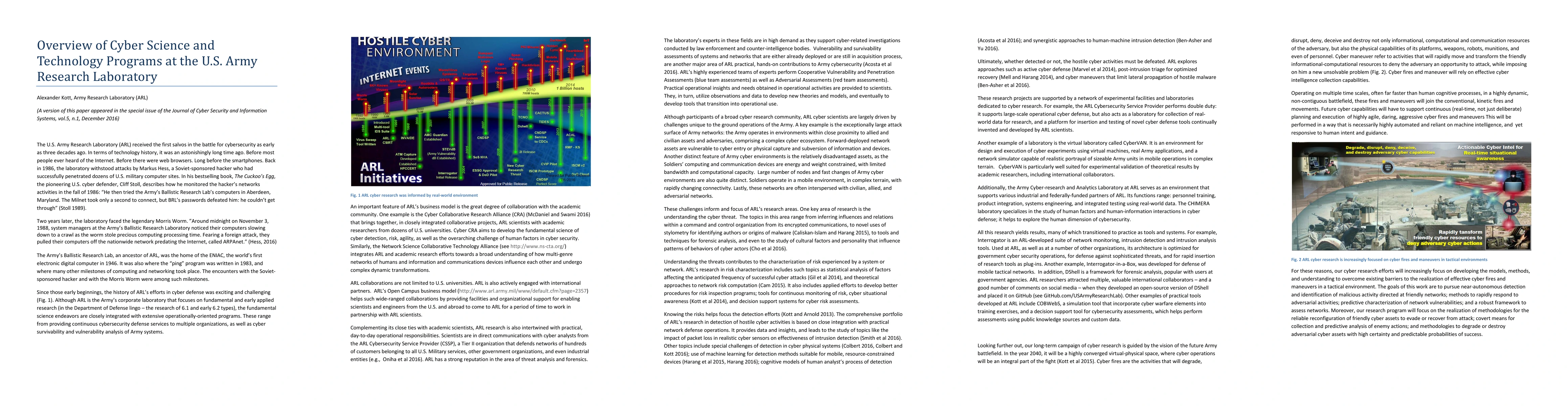 This paper reviews the U.S. Army Research Laboratory's cyber security programs, highlighting the integration of fundamental science with operational needs, exemplified by the Cyber Collaborative Research Alliance. It outlines challenges specific to Army ground operations and how ARL's research aims to address these through a vision of a highly converged virtual-physical battlefield by 2040.