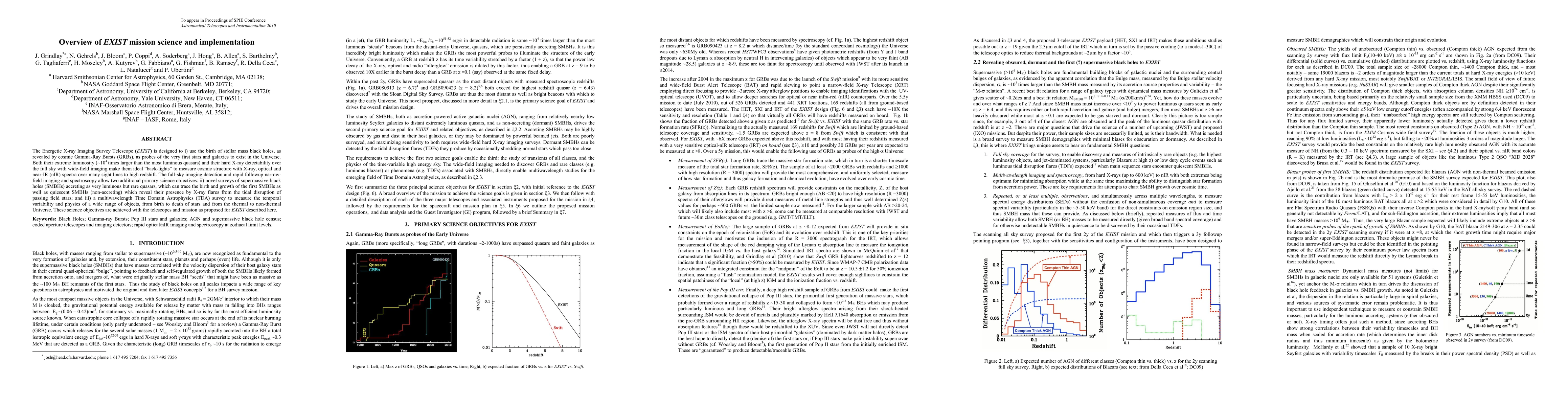 The Energetic X-ray Imaging Survey Telescope (EXIST) is designed to i) use the birth of stellar mass black holes, as revealed by cosmic Gamma-Ray Bursts (GRBs), as probes of the very first stars and galaxies to exist in the Universe. Both their extreme luminosity (~104 times larger than the most luminous quasars) and their hard X-ray detectability over the full sky with wide-field imaging make them ideal "back-lights" to measure cosmic structure with X-ray, optical and near-IR (nIR) spectra over many sight lines to high redshift. The full-sky imaging detection and rapid followup narrow-field imaging and spectroscopy allow two additional primary science objectives: ii) novel surveys of supermassive black holes (SMBHs) accreting as very luminous but rare quasars, which can trace the birth and growth of the first SMBHs as well as quiescent SMBHs (non-accreting) which reveal their presence by X-ray flares from the tidal disruption of passing field stars; and iii) a multiwavelength Time Domain Astrophysics (TDA) survey to measure the temporal variability and physics of a wide range of objects, from birth to death of stars and from the thermal to non-thermal Universe. These science objectives are achieved with the telescopes and mission as proposed for EXIST described here.