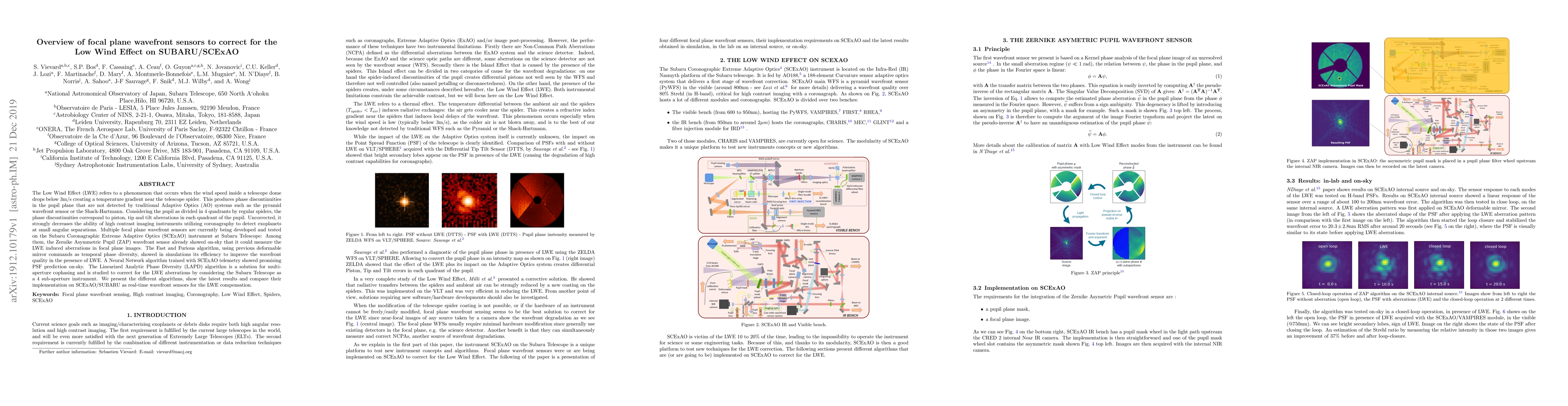 The Low Wind Effect (LWE) refers to a phenomenon that occurs when the wind speed inside a telescope dome drops below $3$m/s creating a temperature gradient near the telescope spider. This produces phase discontinuities in the pupil plane that are not detected by traditional Adaptive Optics (AO) systems such as the pyramid wavefront sensor or the Shack-Hartmann. Considering the pupil as divided in 4 quadrants by regular spiders, the phase discontinuities correspond to piston, tip and tilt aberrations in each quadrant of the pupil. Uncorrected, it strongly decreases the ability of high contrast imaging instruments utilizing coronagraphy to detect exoplanets at small angular separations. Multiple focal plane wavefront sensors are currently being developed and tested on the Subaru Coronagraphic Extreme Adaptive Optics (SCExAO) instrument at Subaru Telescope: Among them, the Zernike Asymmetric Pupil (ZAP) wavefront sensor already showed on-sky that it could measure the LWE induced aberrations in focal plane images. The Fast and Furious algorithm, using previous deformable mirror commands as temporal phase diversity, showed in simulations its efficiency to improve the wavefront quality in the presence of LWE. A Neural Network algorithm trained with SCExAO telemetry showed promising PSF prediction on-sky. The Linearized Analytic Phase Diversity (LAPD) algorithm is a solution for multi-aperture cophasing and is studied to correct for the LWE aberrations by considering the Subaru Telescope as a 4 sub-aperture instrument. We present the different algorithms, show the latest results and compare their implementation on SCExAO/SUBARU as real-time wavefront sensors for the LWE compensation.