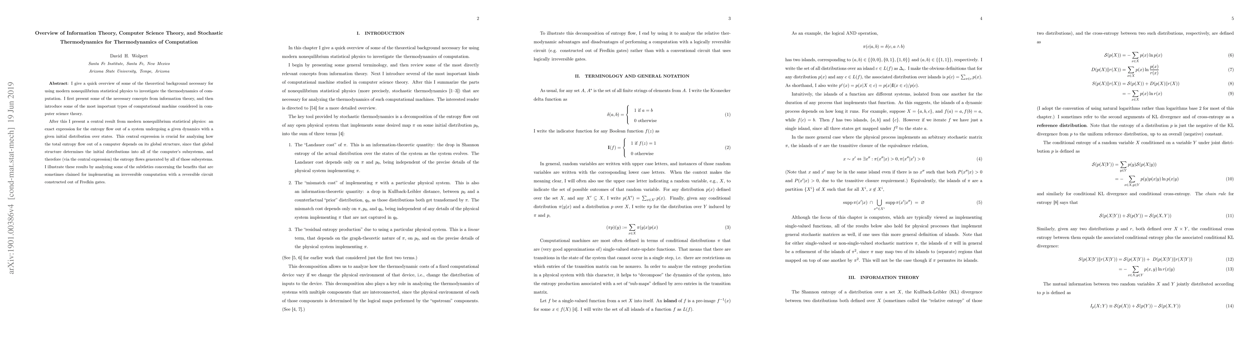 I give a quick overview of some of the theoretical background necessary for using modern non-equilibrium statistical physics to investigate the thermodynamics of computation. I first present some of the necessary concepts from information theory, and then introduce some of the most important types of computational machine considered in computer science theory. After this I present a central result from modern non-equilibrium statistical physics: an exact expression for the entropy flow out of a system undergoing a given dynamics with a given initial distribution over states. This central expression is crucial for analyzing how the total entropy flow out of a computer depends on its global structure, since that global structure determines the initial distributions into all of the computer's subsystems, and therefore (via the central expression) the entropy flows generated by all of those subsystems. I illustrate these results by analyzing some of the subtleties concerning the benefits that are sometimes claimed for implementing an irreversible computation with a reversible circuit constructed out of Fredkin gates.