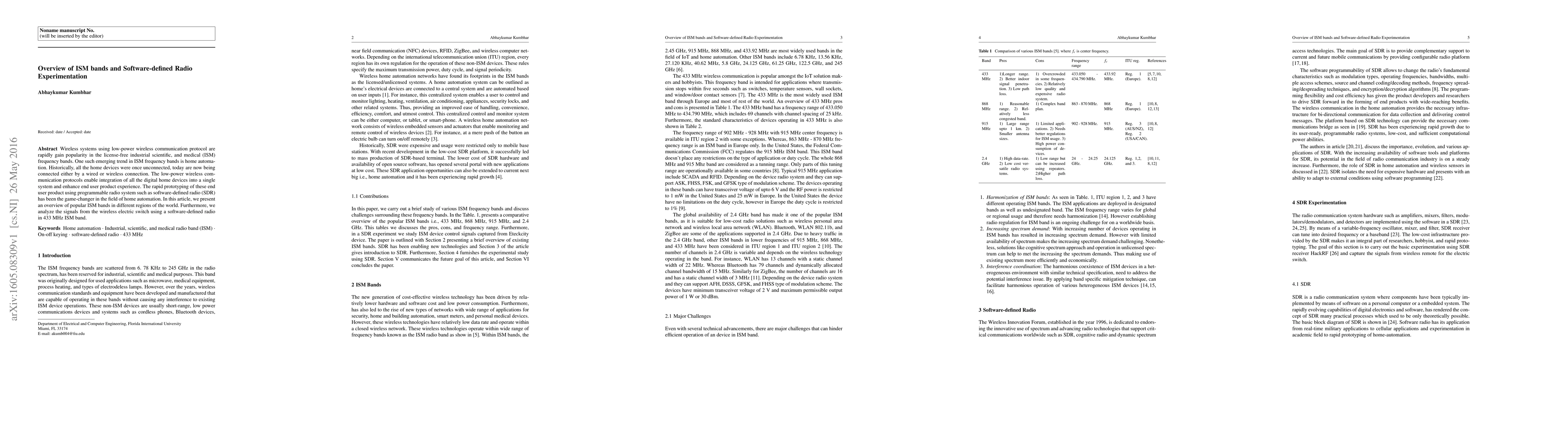 This paper provides an overview of ISM bands and explores the use of software-defined radio (SDR) in home automation. It highlights the growing popularity of low-power wireless communication in ISM bands and examines SDR's role in rapid prototyping of home automation systems, with a specific analysis of wireless electric switch signals in the 433 MHz ISM band.