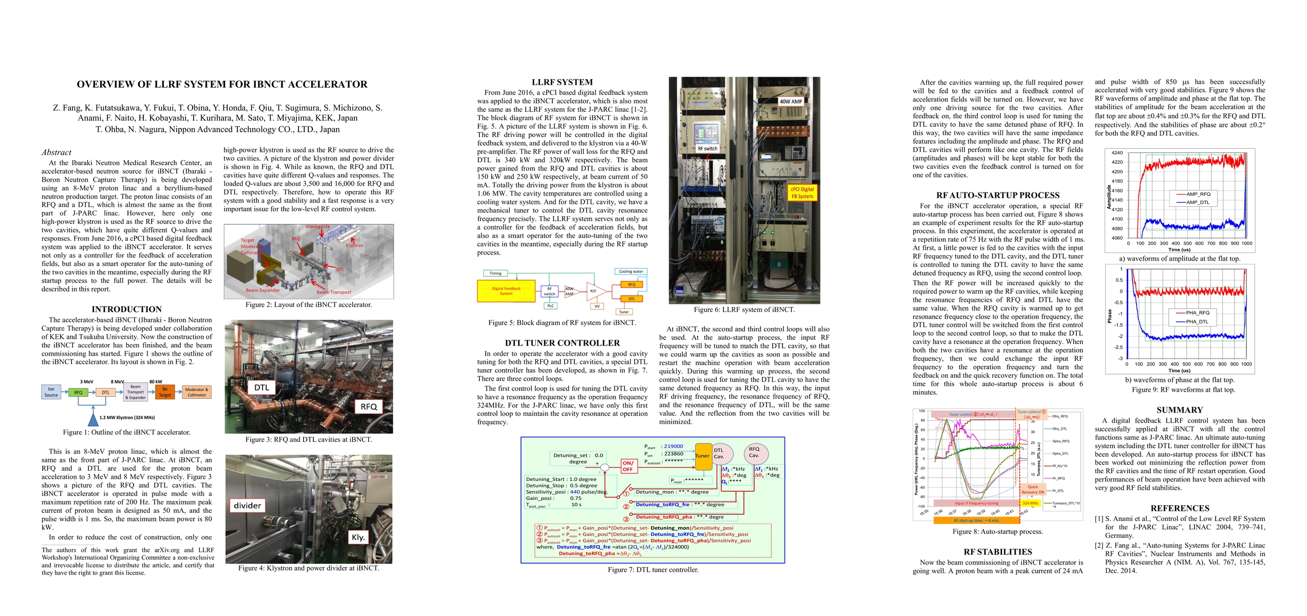 At the Ibaraki Neutron Medical Research Center, an accelerator-based neutron source for iBNCT (Ibaraki - Boron Neutron Capture Therapy) is being developed using an 8-MeV proton linac and a beryllium-based neutron production target. The proton linac consists of an RFQ and a DTL, which is almost the same as the front part of J-PARC linac. However, here only one high-power klystron is used as the RF source to drive the two cavities, which have quite different Q-values and responses. From June 2016, a cPCI based digital feedback system was applied to the iBNCT accelerator. It serves not only as a controller for the feedback of acceleration fields, but also as a smart operator for the auto-tuning of the two cavities in the meantime, especially during the RF startup process to the full power. The details will be described in this report.