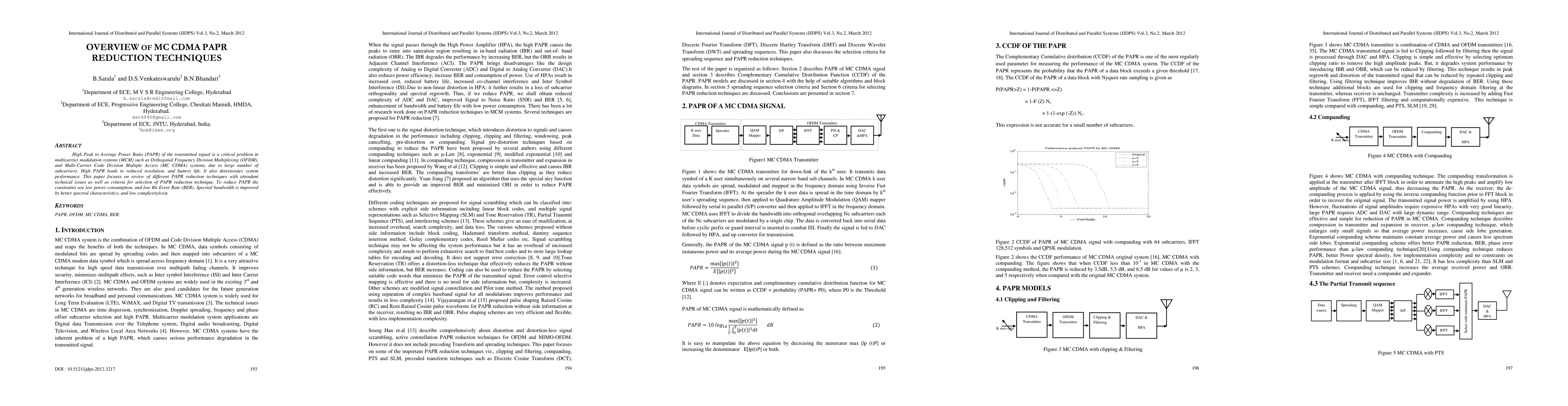 This paper reviews various techniques to reduce Peak-to-Average Power Ratio (PAPR) in MC CDMA systems, with a focus on low power consumption and improved spectral bandwidth. The goal is to improve system performance, reduce battery life, and enhance overall efficiency.