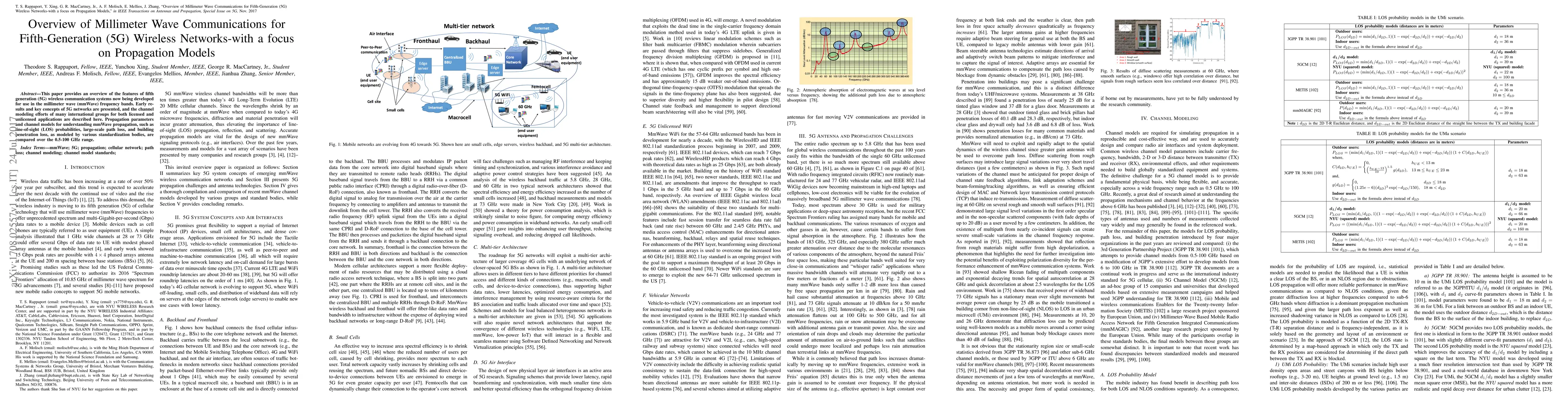 This paper reviews 5G wireless communication systems operating in millimeter wave (mmWave) bands, highlighting key concepts and early results. It compares propagation models and parameters, including line-of-sight probabilities and path loss, across the 0.5-100 GHz range, as developed by international standardization bodies.