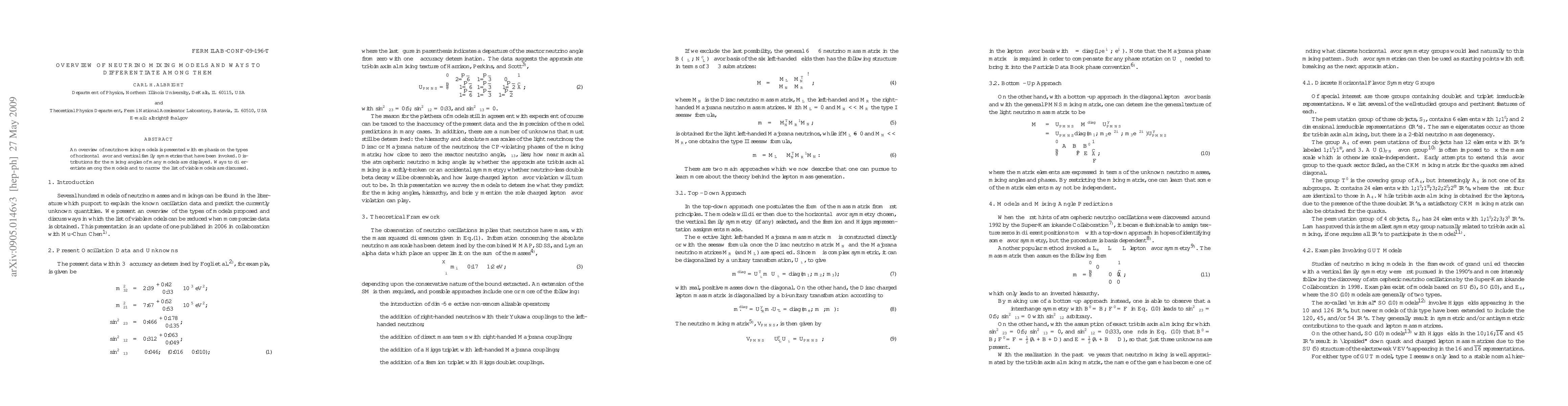 An overview of neutrino-mixing models is presented with emphasis on the types of horizontal flavor and vertical family symmetries that have been invoked. Distributions for the mixing angles of many models are displayed. Ways to differentiate among the models and to narrow the list of viable models are discussed.