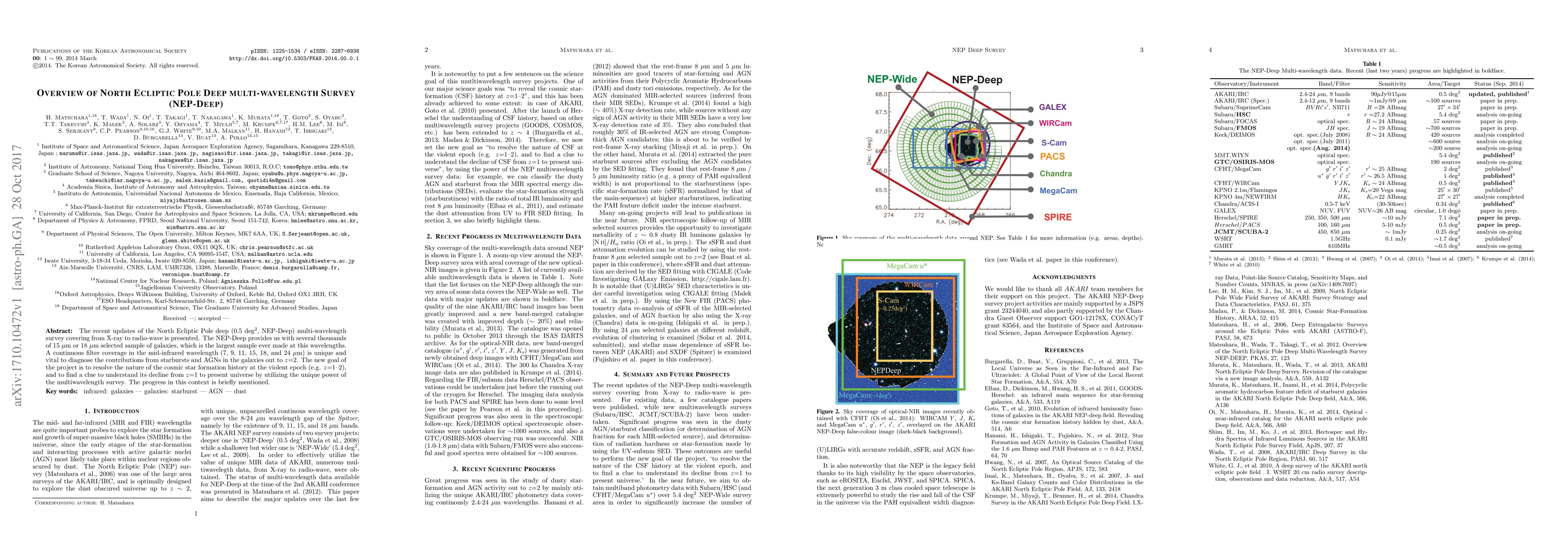 The recent updates of the North Ecliptic Pole deep (0.5~deg$^2$, NEP-Deep) multi-wavelength survey covering from X-ray to radio-wave is presented. The NEP-Deep provides us with several thousands of 15~$\mu$m or 18~$\mu$m selected sample of galaxies, which is the largest sample ever made at this wavelengths. A continuous filter coverage in the mid-infrared wavelength (7, 9, 11, 15, 18, and 24~$\mu$m) is unique and vital to diagnose the contributions from starbursts and AGNs in the galaxies out to $z$=2.The new goal of the project is to resolve the nature of the cosmic star formation history at the violent epoch (e.g. $z$=1--2), and to find a clue to understand its decline from $z$=1 to present universe by utilizing the unique power of the multi-wavelength survey. The progress in this context is briefly mentioned.