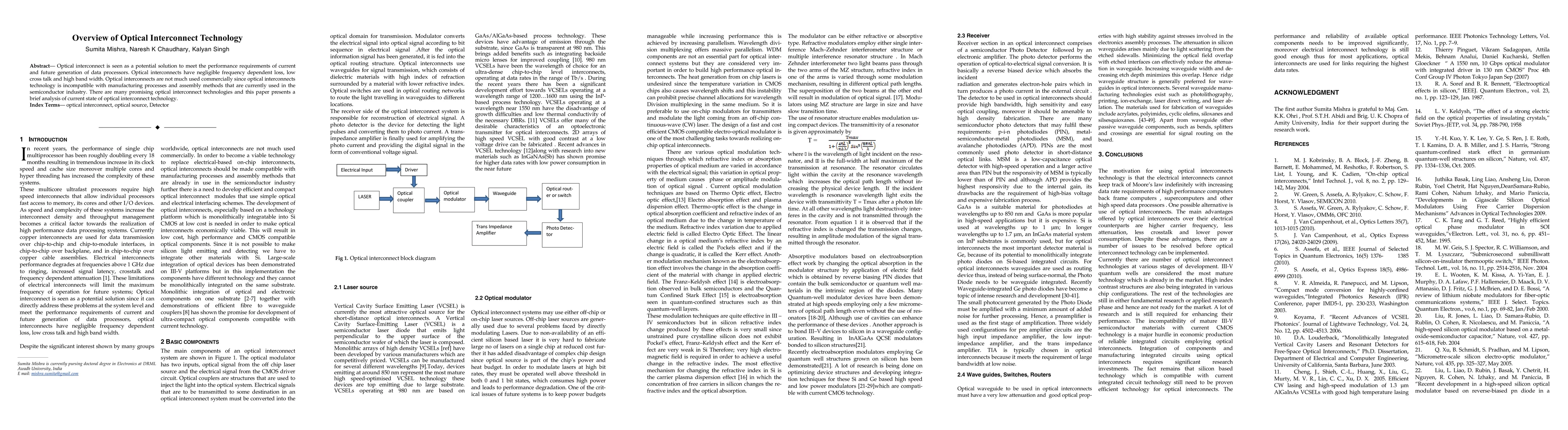 This paper reviews the potential of optical interconnect technology to meet the performance demands of modern data processors due to its high bandwidth and low cross talk, while noting its current lack of commercial use due to incompatibility with existing semiconductor manufacturing processes. It provides an analysis of current optical interconnect technologies.