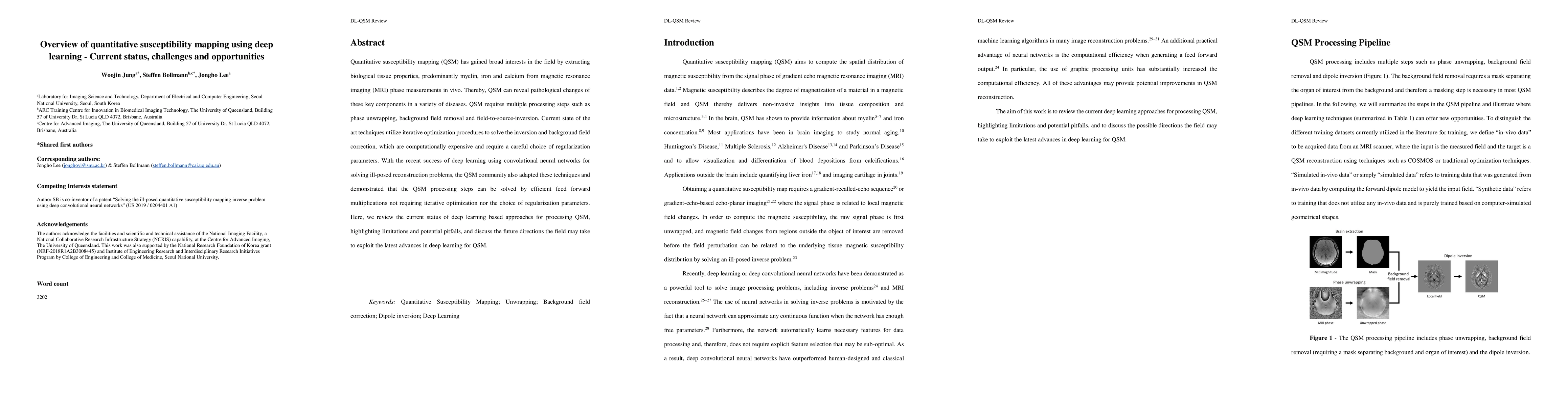 Deep learning techniques, specifically convolutional neural networks, have been successfully applied to quantitative susceptibility mapping (QSM) in MRI, simplifying complex processing steps and eliminating the need for computationally expensive iterative optimization and manual regularization parameter selection. The review discusses current methods, limitations, and future opportunities in this area.