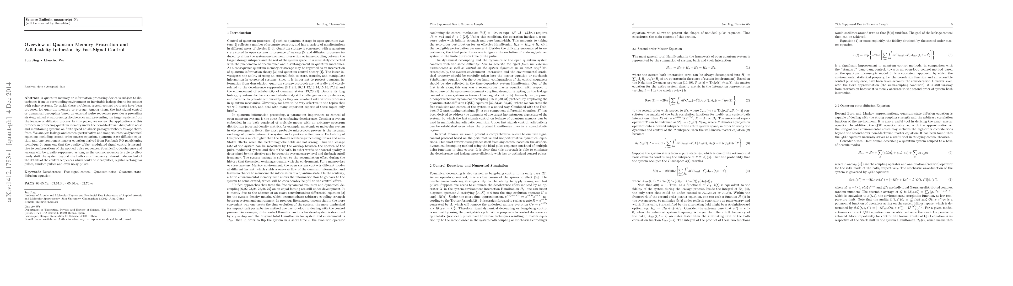 A quantum memory or information processing device is subject to disturbance from its surrounding environment or inevitable leakage due to its contact with other systems. To tackle these problems, several control protocols have been proposed for quantum memory or storage. Among them, the fast-signal control or dynamical decoupling based on external pulse sequences provides a prevailing strategy aimed at suppressing decoherence and preventing the target systems from the leakage or diffusion process. In this paper, we review the applications of this protocol in protecting quantum memory under the non-Markovian dissipative noise and maintaining systems on finite speed adiabatic passages without leakage there-from. We analyze leakage and control perturbative and nonperturbative dynamical equations including second-order master equation, quantum-state-diffusion equation, and one-component master equation derived from Feshbach PQ-partitioning technique. It turns out that the quality of fast-modulated signal control is insensitive to configurations of the applied pulse sequences. Specifically, decoherence and leakage will be greatly suppressed as long as the control sequence is able to effectively shift the system beyond the bath cutoff frequency, almost independent of the details of the control sequences which could be ideal pulses, regular rectangular pulses, random pulses and even noisy pulses.
