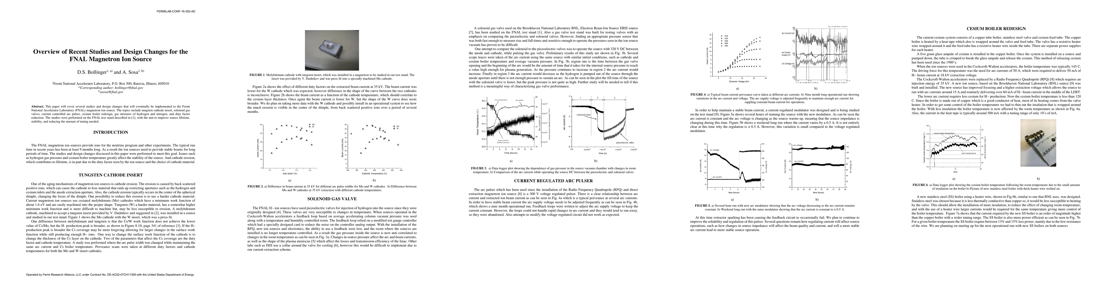 This paper reviews recent studies and design modifications for the FNAL magnetron ion source, focusing on enhancements like tungsten cathode inserts, solenoid gas valves, and cesium boiler redesign to improve source lifetime, stability, and operational efficiency.
