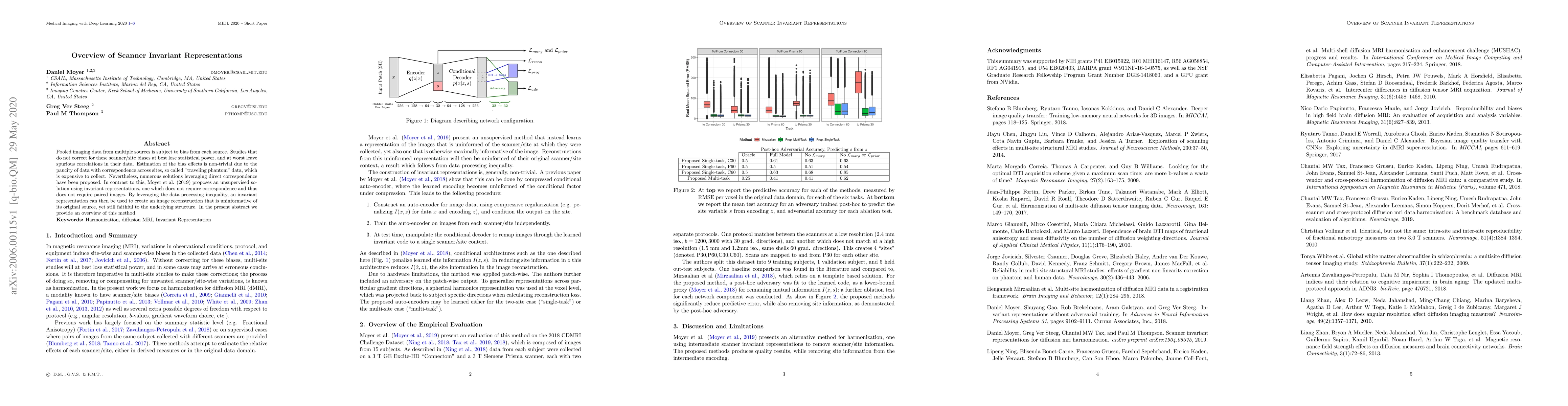 This paper discusses a method proposed by Moyer et al. (2019) for correcting scanner biases in pooled imaging data without requiring correspondence or paired images. The approach uses unsupervised invariant representations, leveraging the data processing inequality to create a source-uninformative yet structurally faithful image reconstruction.