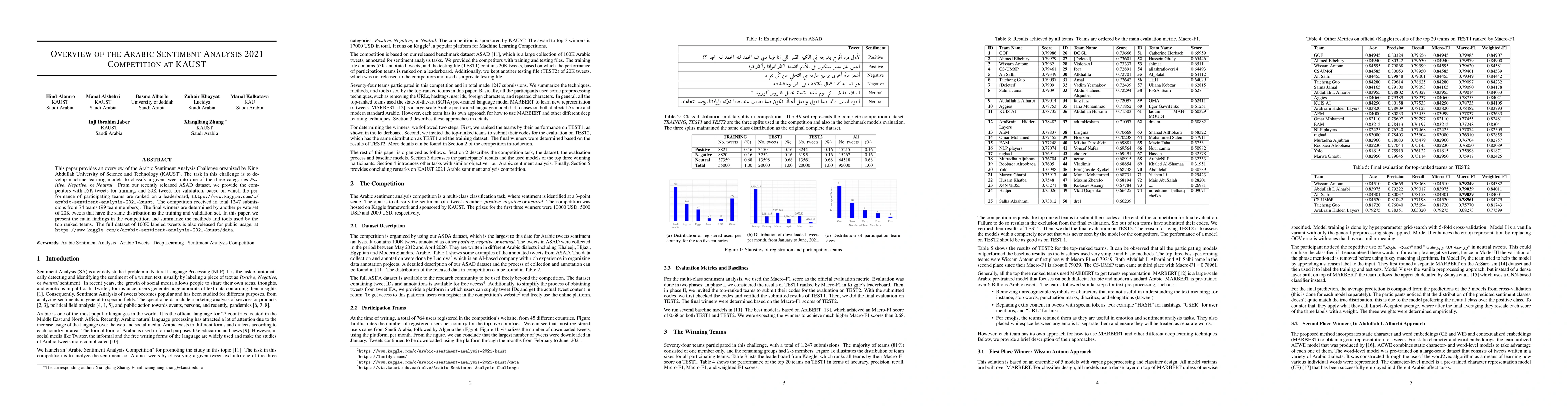 This paper details the Arabic Sentiment Analysis 2021 competition at KAUST, which involved developing machine learning models to classify 75K Arabic tweets into Positive, Negative, or Neutral categories. The competition saw 74 teams submit 1247 entries, with top teams' methods and results summarized.