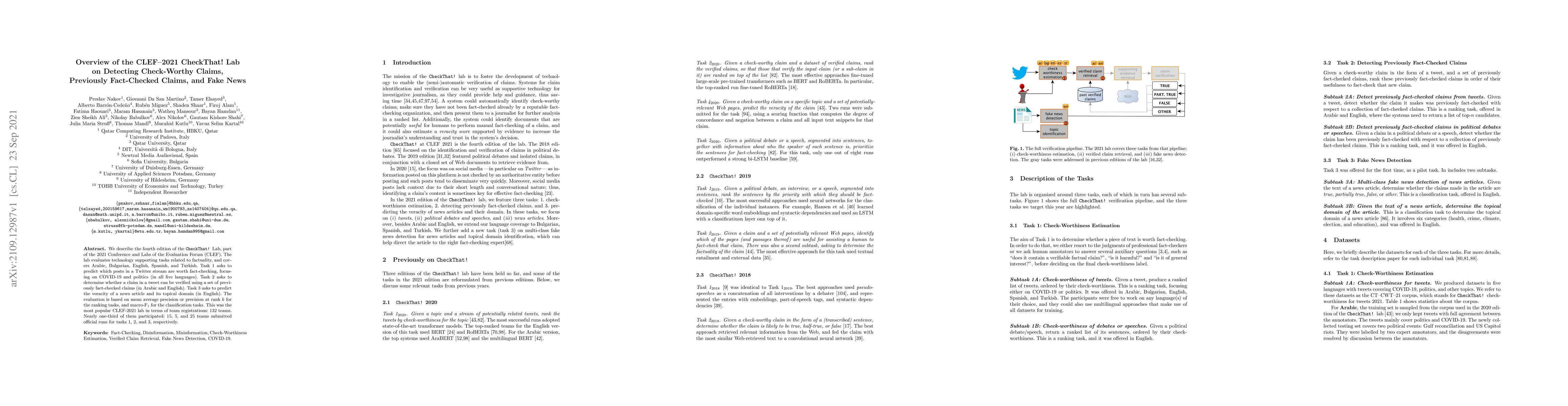 The CLEF-2021 CheckThat! Lab evaluated technology for detecting fact-worthy claims, previously fact-checked claims, and fake news across multiple languages. The lab included three tasks: predicting fact-check worth, verifying claims against previous checks, and assessing news article veracity.
