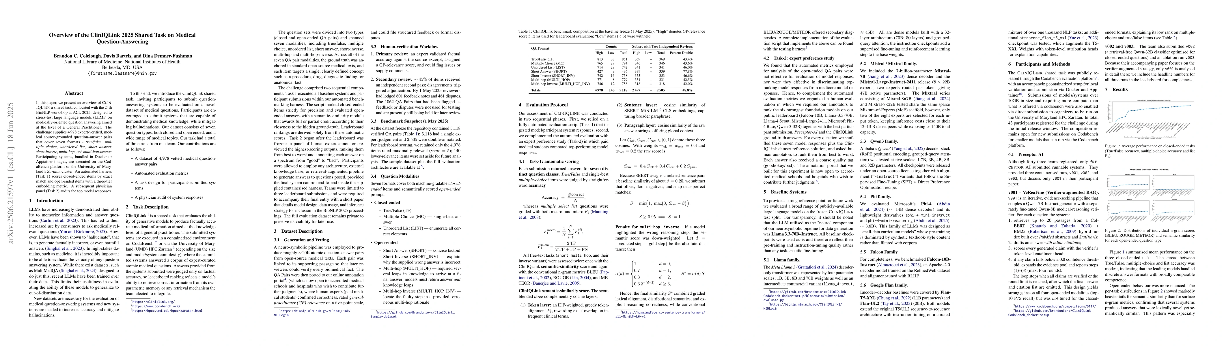 In this paper, we present an overview of ClinIQLink, a shared task, collocated with the 24th BioNLP workshop at ACL 2025, designed to stress-test large language models (LLMs) on medically-oriented question answering aimed at the level of a General Practitioner. The challenge supplies 4,978 expert-verified, medical source-grounded question-answer pairs that cover seven formats: true/false, multiple choice, unordered list, short answer, short-inverse, multi-hop, and multi-hop-inverse. Participating systems, bundled in Docker or Apptainer images, are executed on the CodaBench platform or the University of Maryland's Zaratan cluster. An automated harness (Task 1) scores closed-ended items by exact match and open-ended items with a three-tier embedding metric. A subsequent physician panel (Task 2) audits the top model responses.