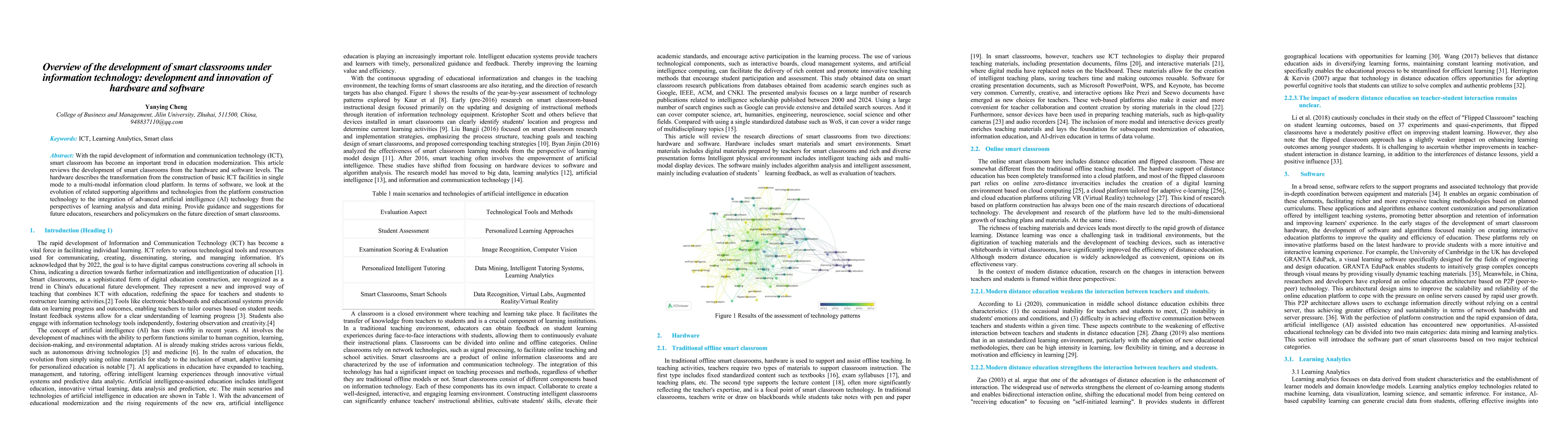 With the rapid development of information and communication technology (ICT), smart classroom has become an important trend in education modernization. This article reviews the development of smart classrooms from the hardware and software levels. The hardware describes the transformation from the construction of basic ICT facilities in single mode to a multi-modal information cloud platform. In terms of software, we look at the evolution of related supporting algorithms and technologies from the platform construction technology to the integration of advanced artificial intelligence (AI) technology from the perspectives of learning analysis and data mining. Provide guidance and suggestions for future educators, researchers and policymakers on the future direction of smart classrooms.